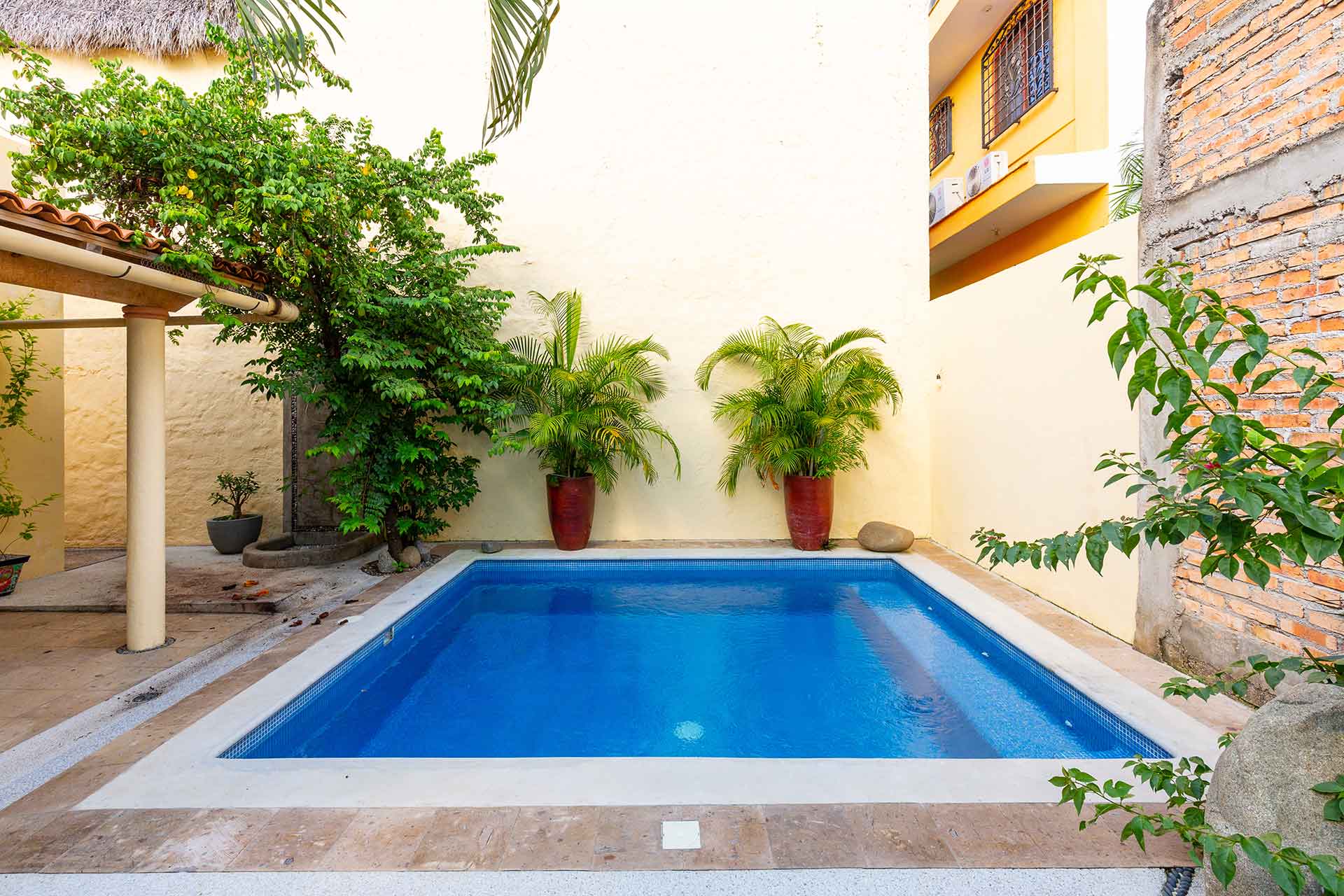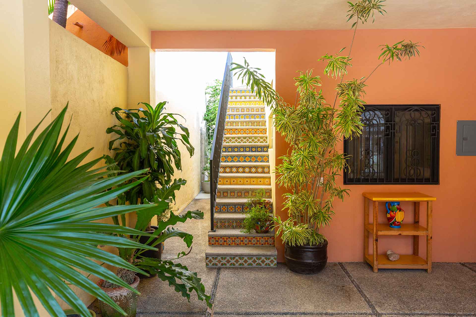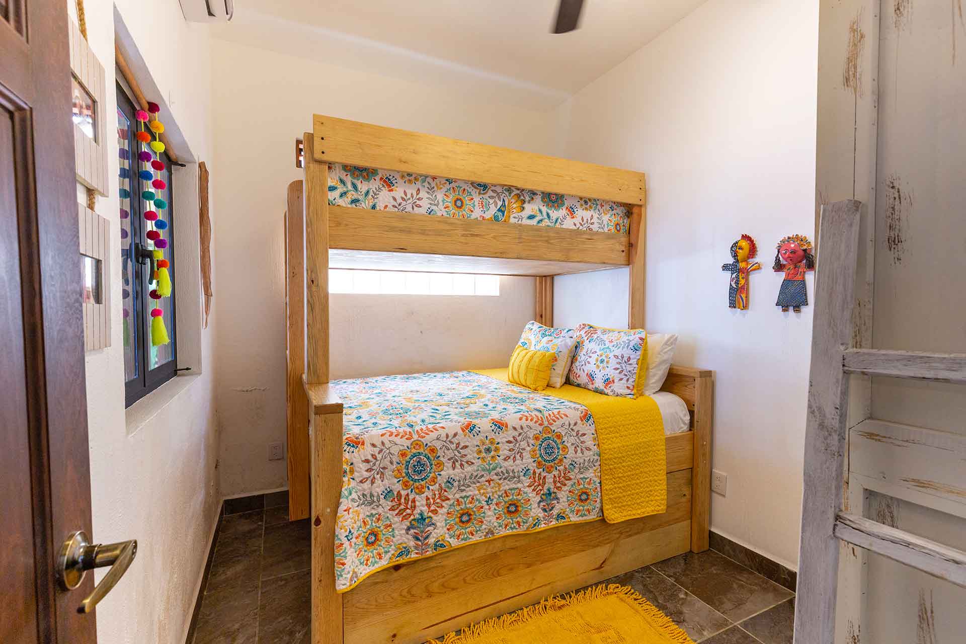 As one enters the home from the street, immediately to the right is the main queen bedroom. Continue down the hall to the full bathroom and second bedroom hosting a bunk bed with a full and single size beds. Casa Amorosa has a well-appointed kitchen with breakfast bar and cozy living room which leads outside to the heated pool terrace with a shaded dining area. From the carport, a colorful Mexican tiled exterior staircase leads you to the top of the house, with potential to build out a lovely roof top terrace.