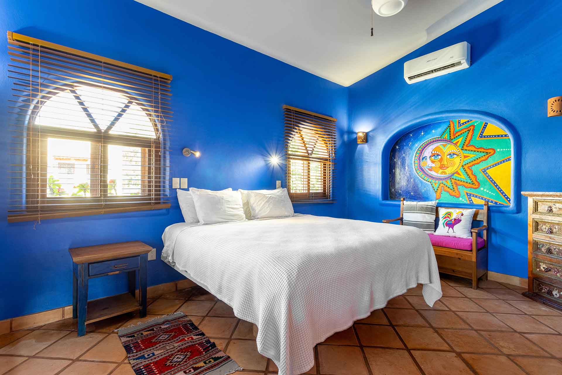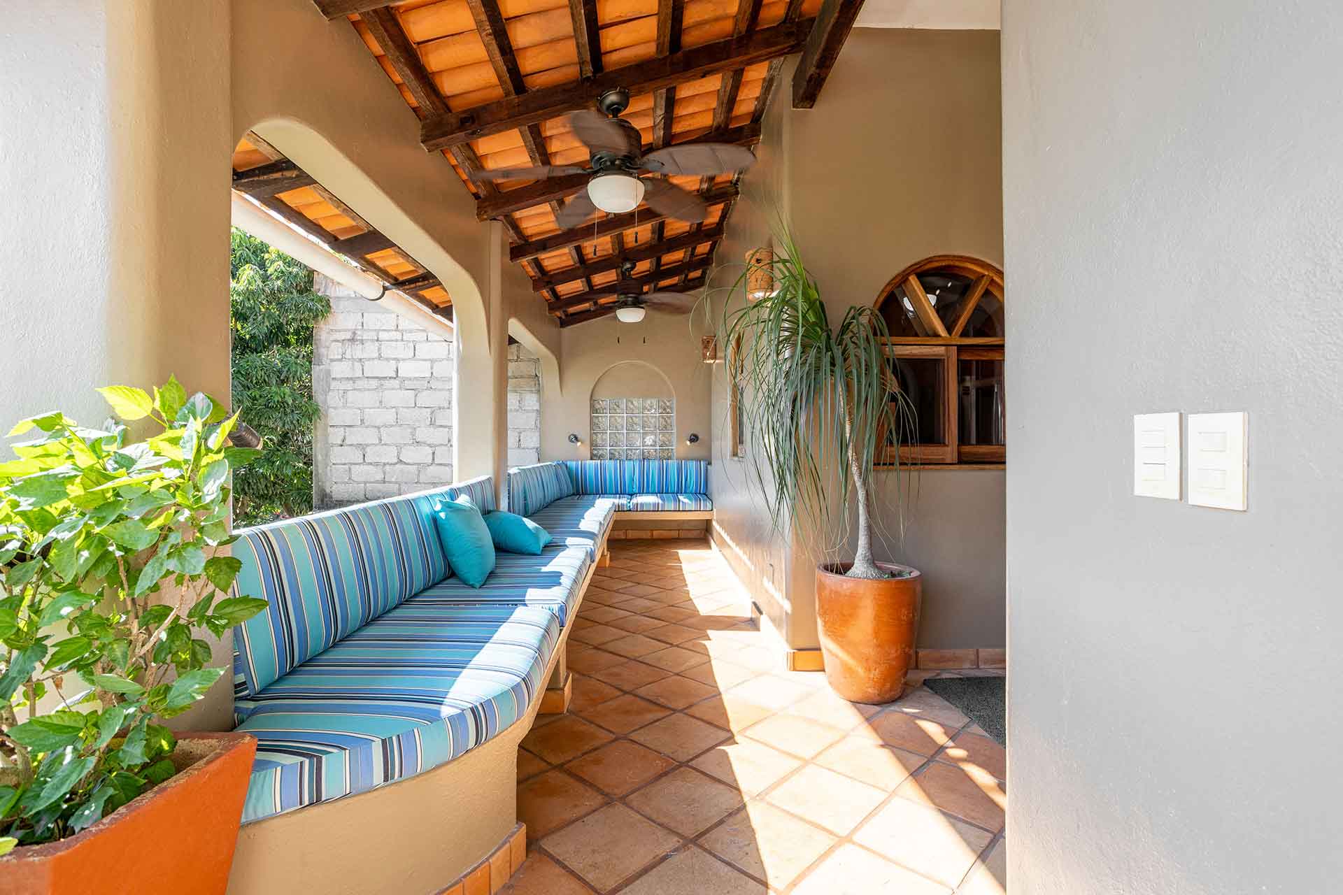 Casa de los Milagros is situated on the upper level, and includes two elevated terraces. The charming master suite, with its large window box of cascading bougainvillea, has a king size bed, A/C, and a spacious bathroom with shower.  The second bedroom has a queen size bed, A/C, and ceiling fan, and uses the adjacent full bathroom with a large tiled shower.