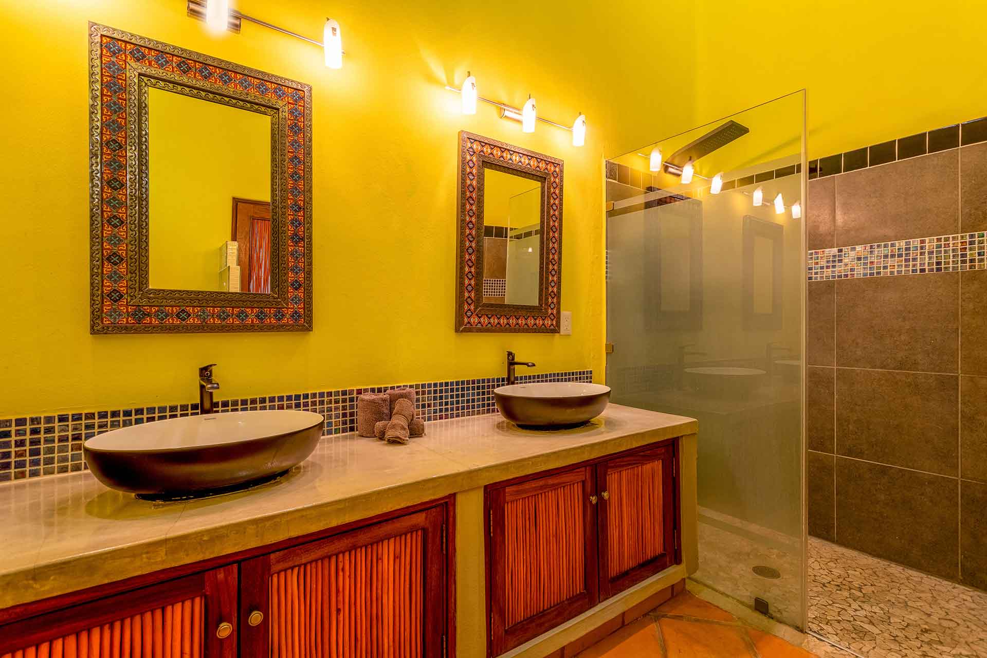 The shared rooftop terrace is covered by a magnificent open palapa with breathtaking 360 degree views of the pueblo, surrounding mountains, jungle, and a glimpse of the ocean. Lounge in the shade, reclining on soft cushioned couches while enjoying the gentle ocean breeze, or enhance your tan on the adjacent open terrace. Sipping your favorite beverage at the bar while enjoying the bright sunrise or crimson sunsets makes this the perfect space to share with friends or family.
