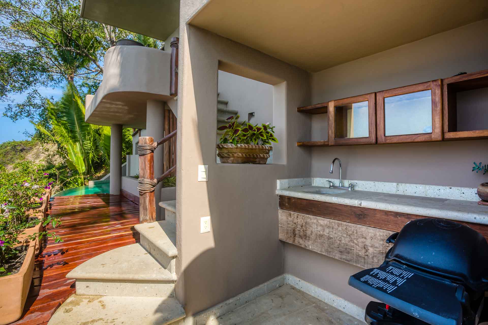 Meander below to another lower level patio with a BBQ, wet bar, two chaise lounges, an umbrella and a dining table for four. Continuing further out, you will find the ocean view pool. Take the path down a private stairway leading you down the mountain side and to the secluded beach cove below.