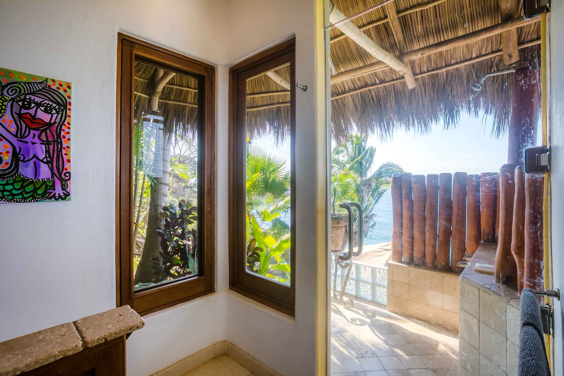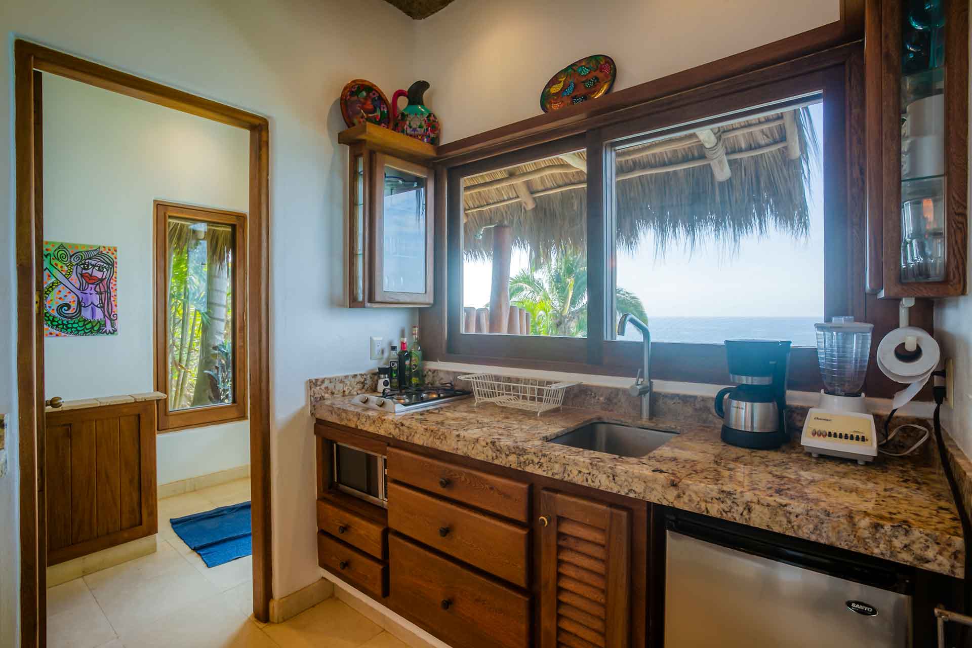 After passing through the iron entrance gate, through flowering gardens and giant palm trees, you will see the second king en-suite bedroom with outdoor shower, ocean view terrace, mini fridge and coffee pot. Descend several garden steps over a wooden bridge and through an antique door into the entry level bedroom hosting a king size bed, outdoor shower, kitchenette and terrace. The kitchenette hosts a two-burner stove-top, microwave and mini fridge.