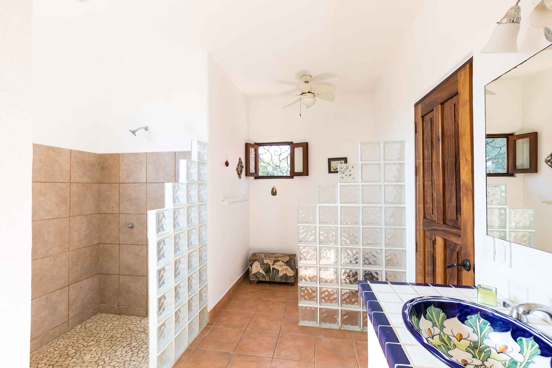 Casa Kalea (named after the current owner’s granddaughter) is a spacious, three-bed, two-bath home located in the residential area of El Izote, an easy stroll to all of San Pancho’s local restaurants and shops. This multi level home has two large bedrooms downstairs that share a large bathroom. One of the bedrooms has twin beds and one has a queen. The master bedroom suite, with a private bath and located upstairs boasts beautiful stained glass windows above the queen size bed. The living area is sunny, bright and comfortable and has glass doors leading to an outdoor courtyard with a private pool and terrace located at the pools edge.