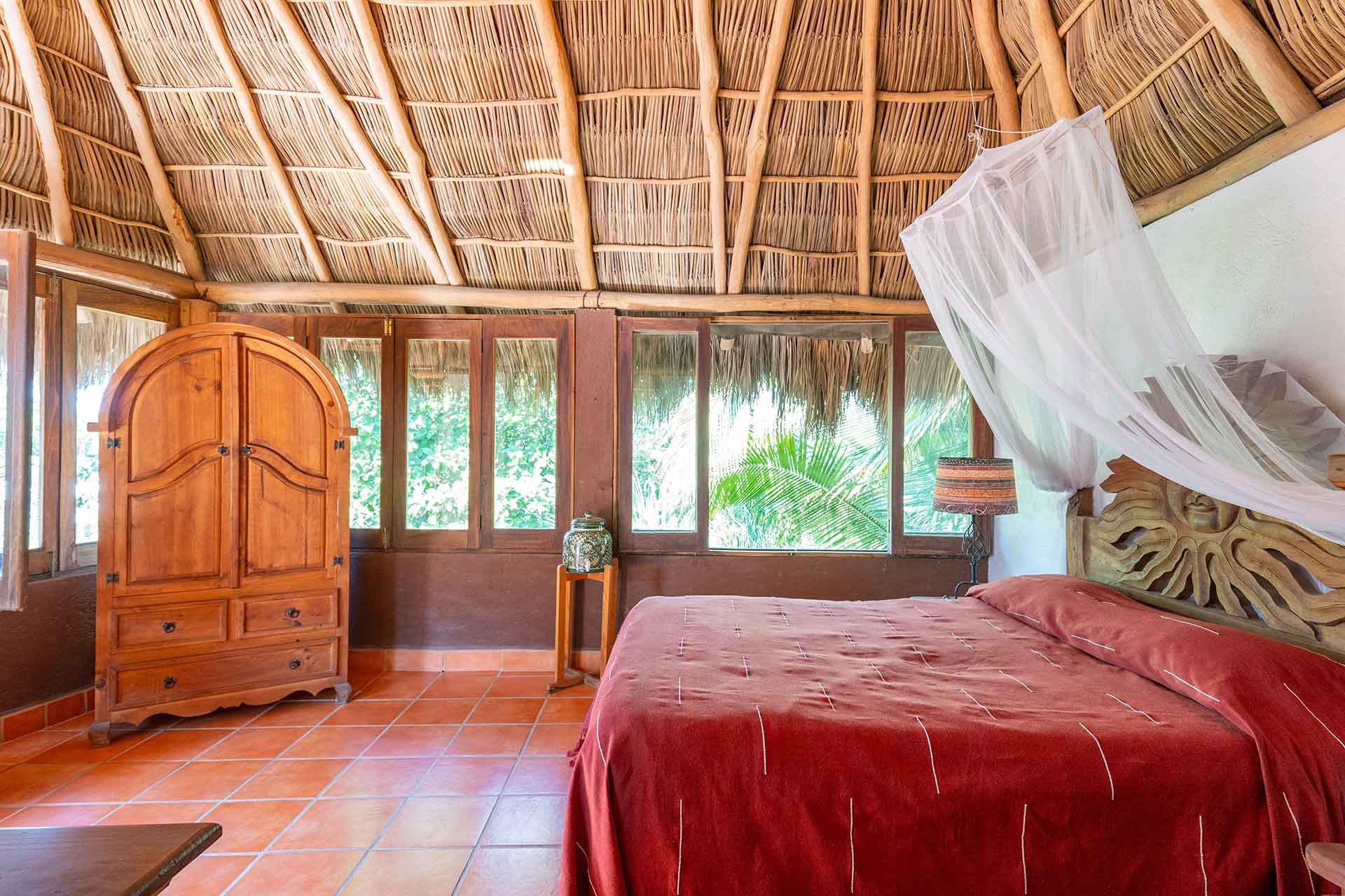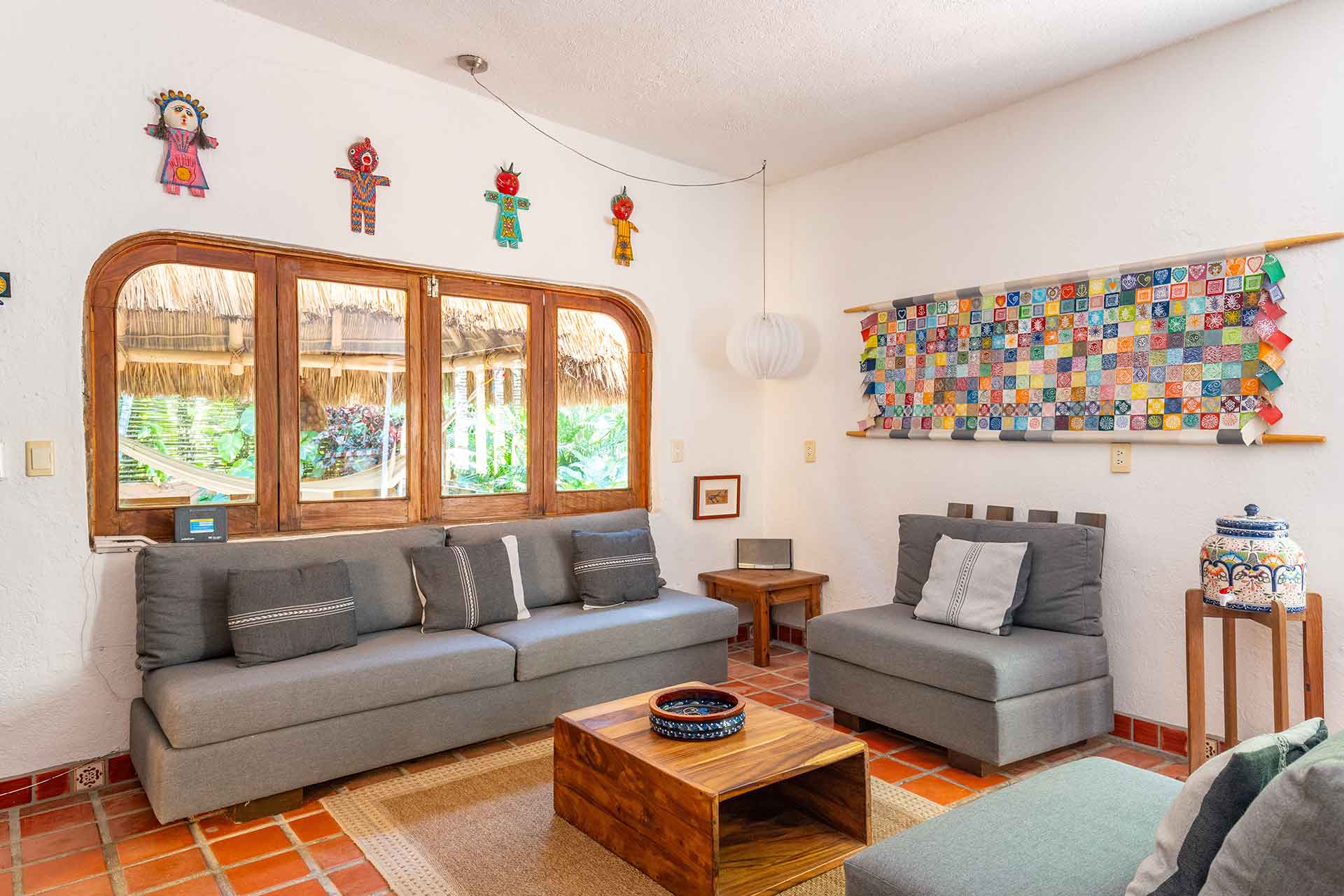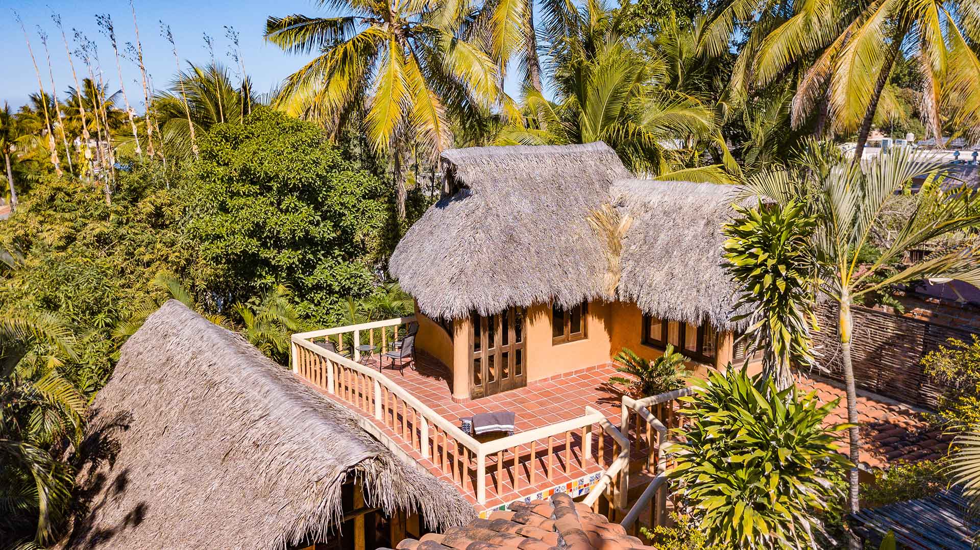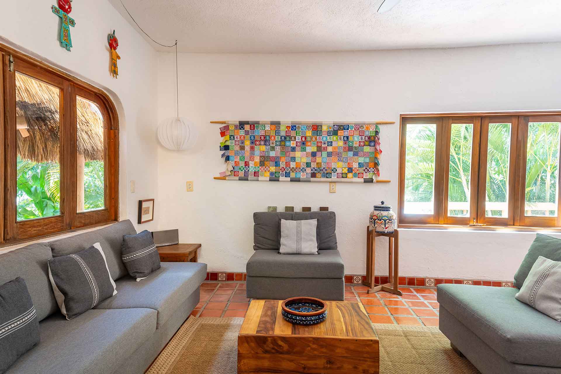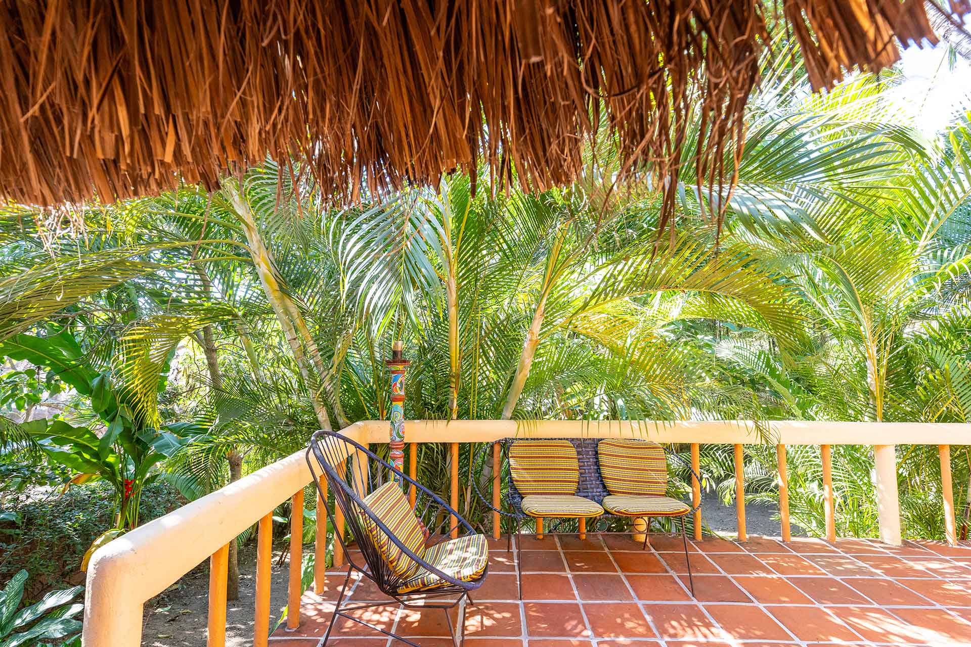 The property consists of two separate buildings with tropical rustic flair and palapa roofing throughout. The main two-story quarters hosts a living area and kitchen that connect to the back terrace and side patio area. Also on the lower level, rests the guest bedroom with queen size bed and full bathroom. The second story hosts a queen en suite bedroom under a palapa roof with a terrace. The detached cabana bedroom hosts a queen bed with full bathroom.