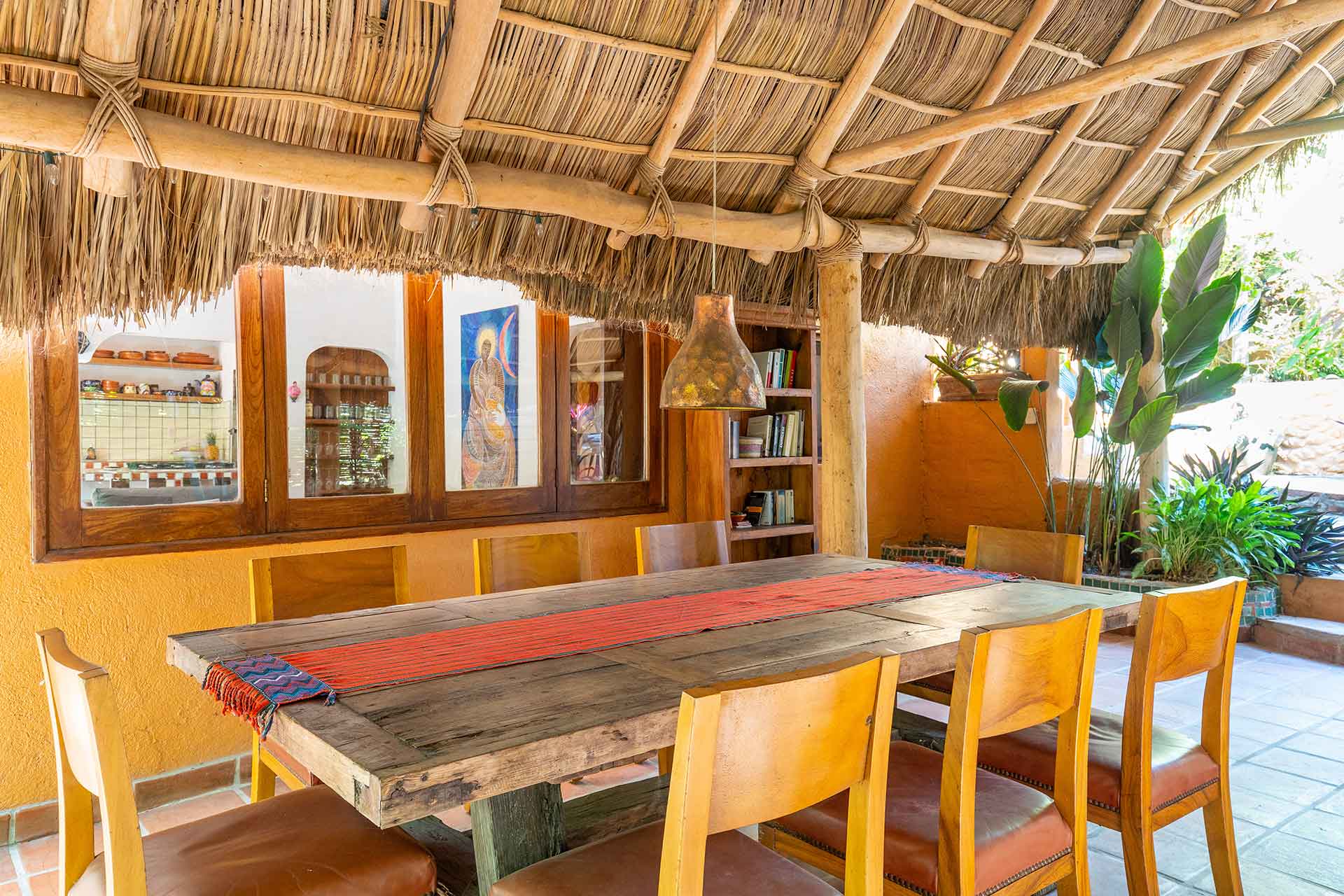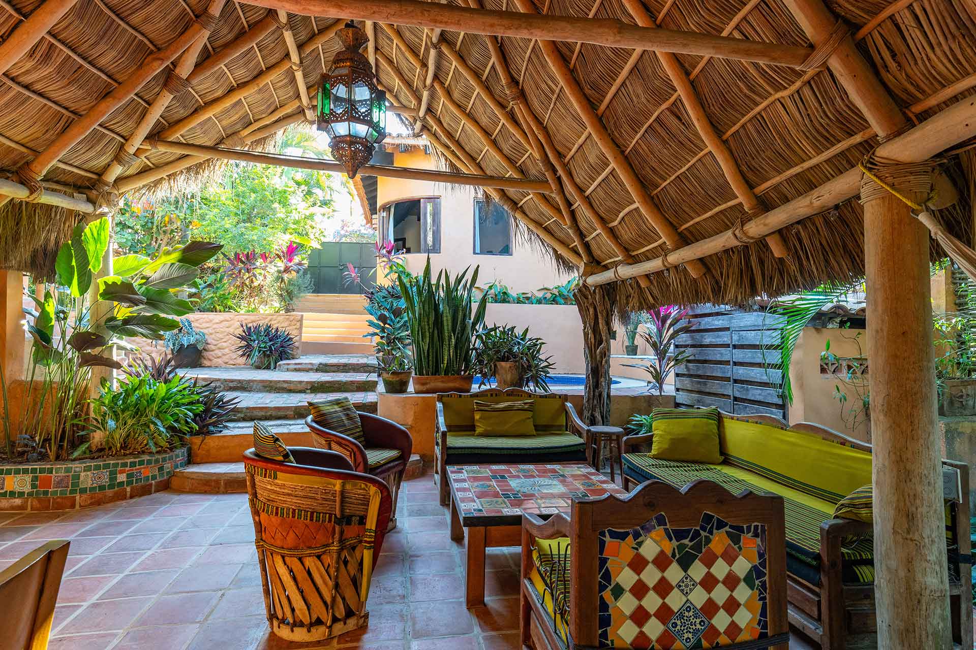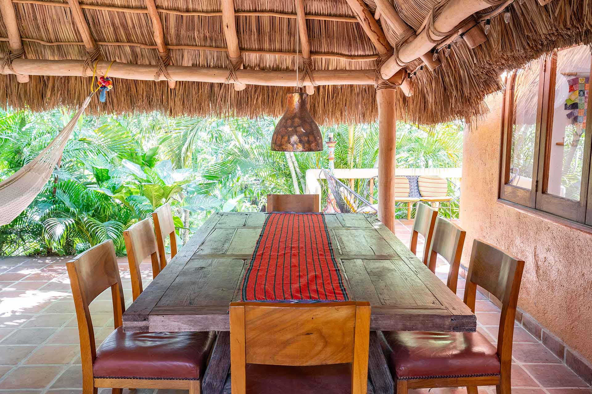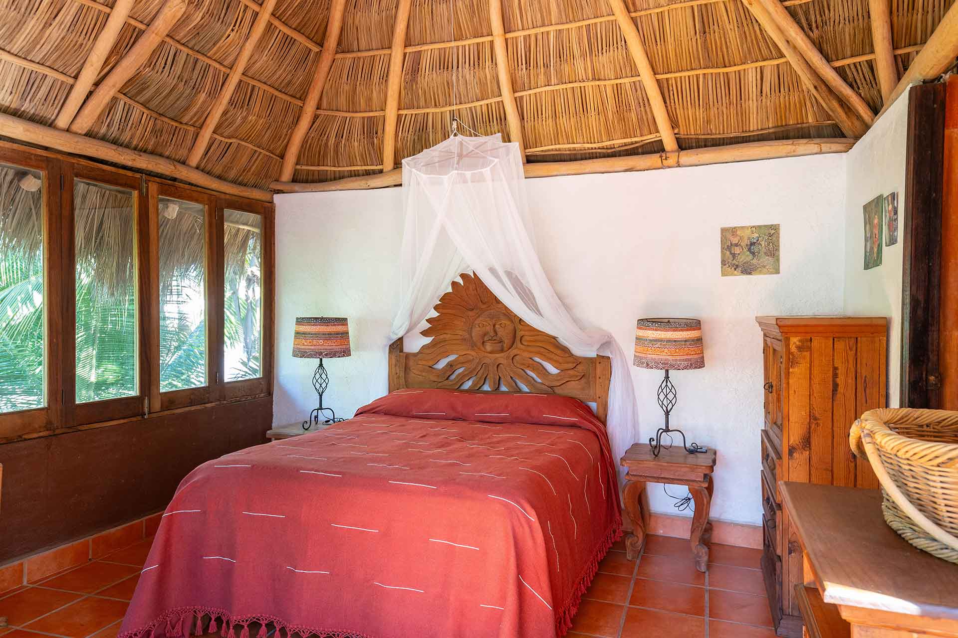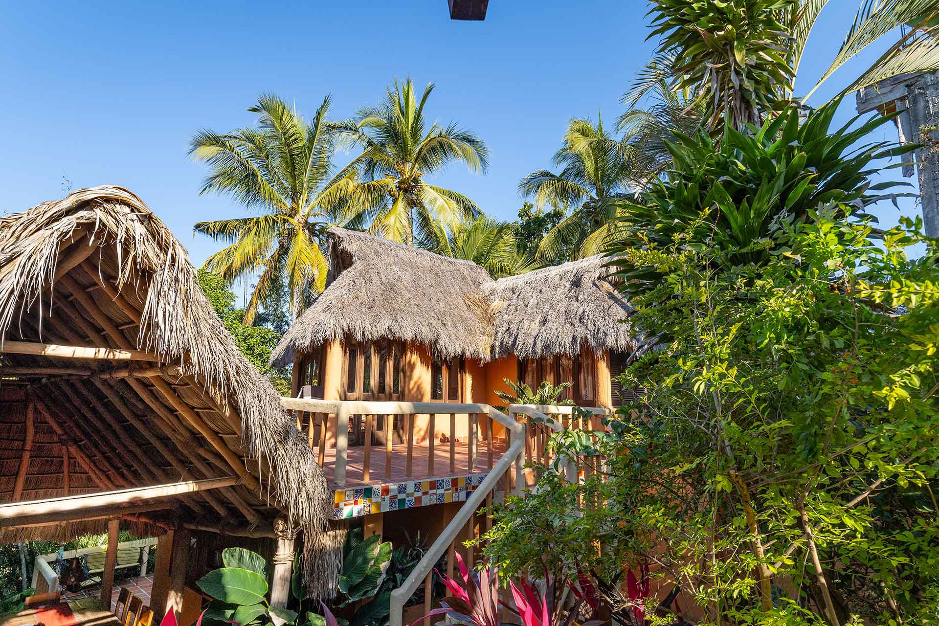 The property consists of two separate buildings with tropical rustic flair and palapa roofing throughout. The main two-story quarters hosts a living area and kitchen that connect to the back terrace and side patio area. Also on the lower level, rests the guest bedroom with queen size bed and full bathroom. The second story hosts a queen en suite bedroom under a palapa roof with a terrace. The detached cabana bedroom hosts a queen bed with full bathroom.