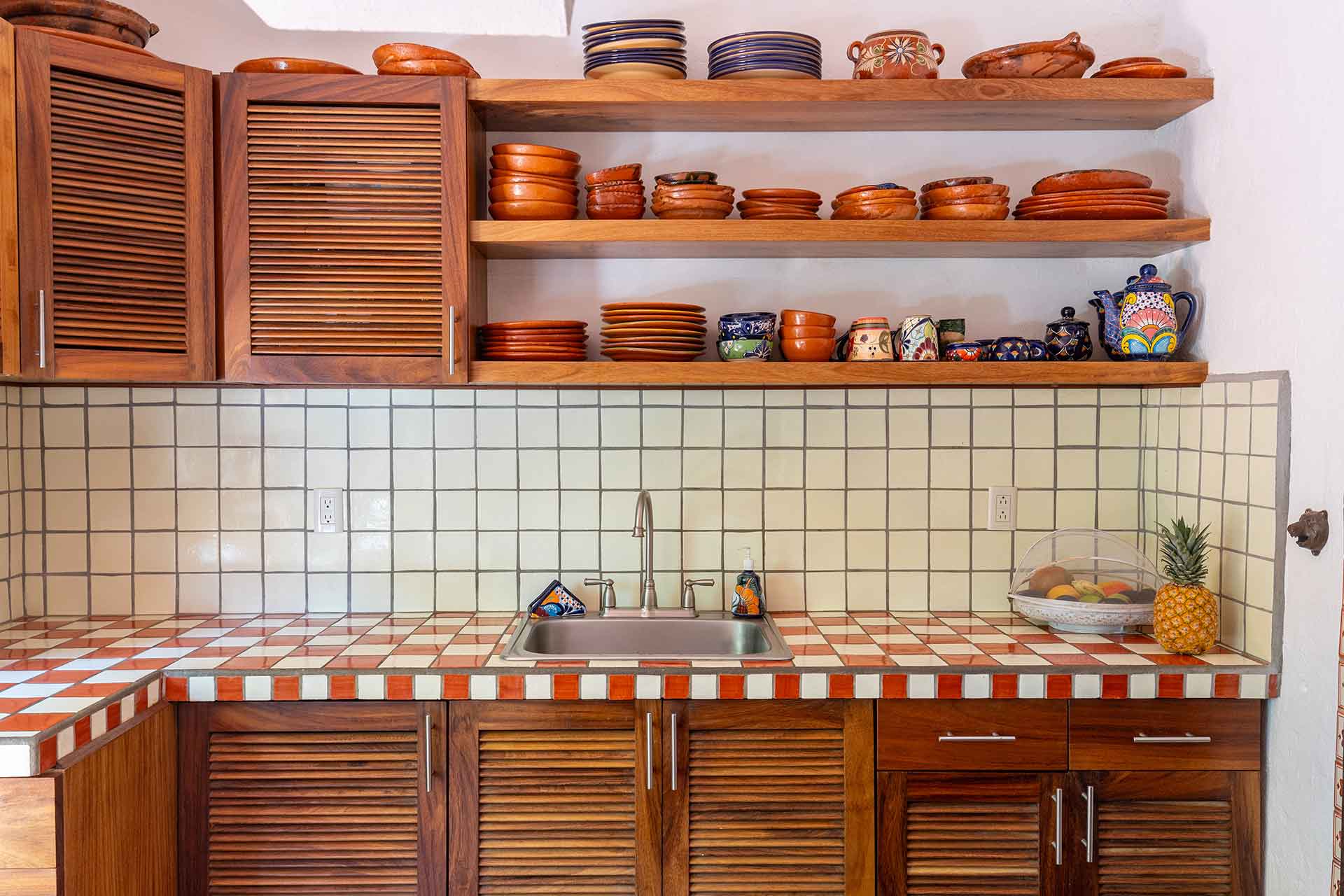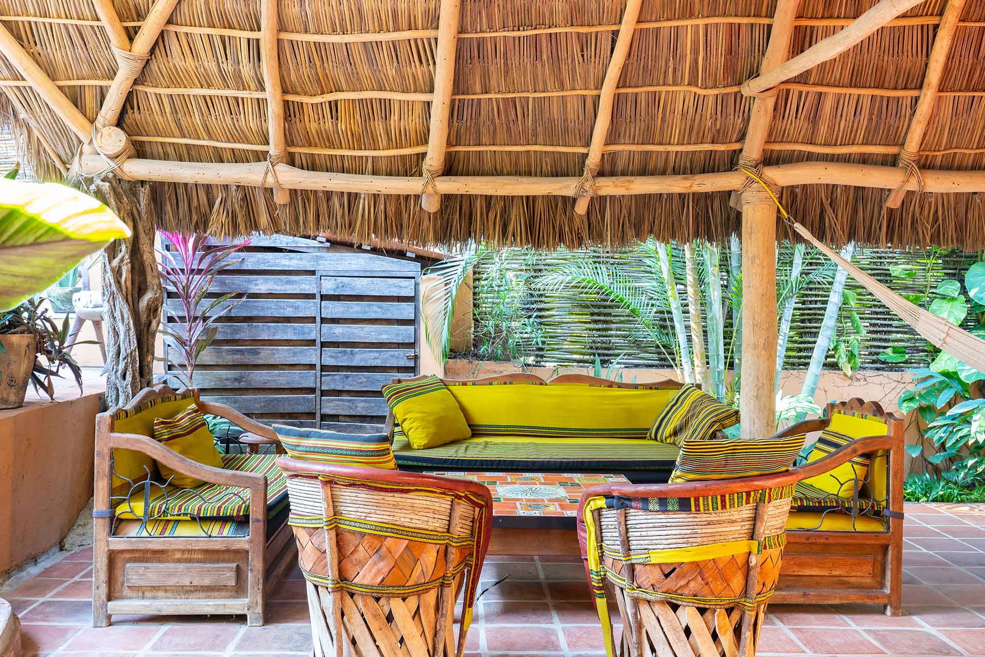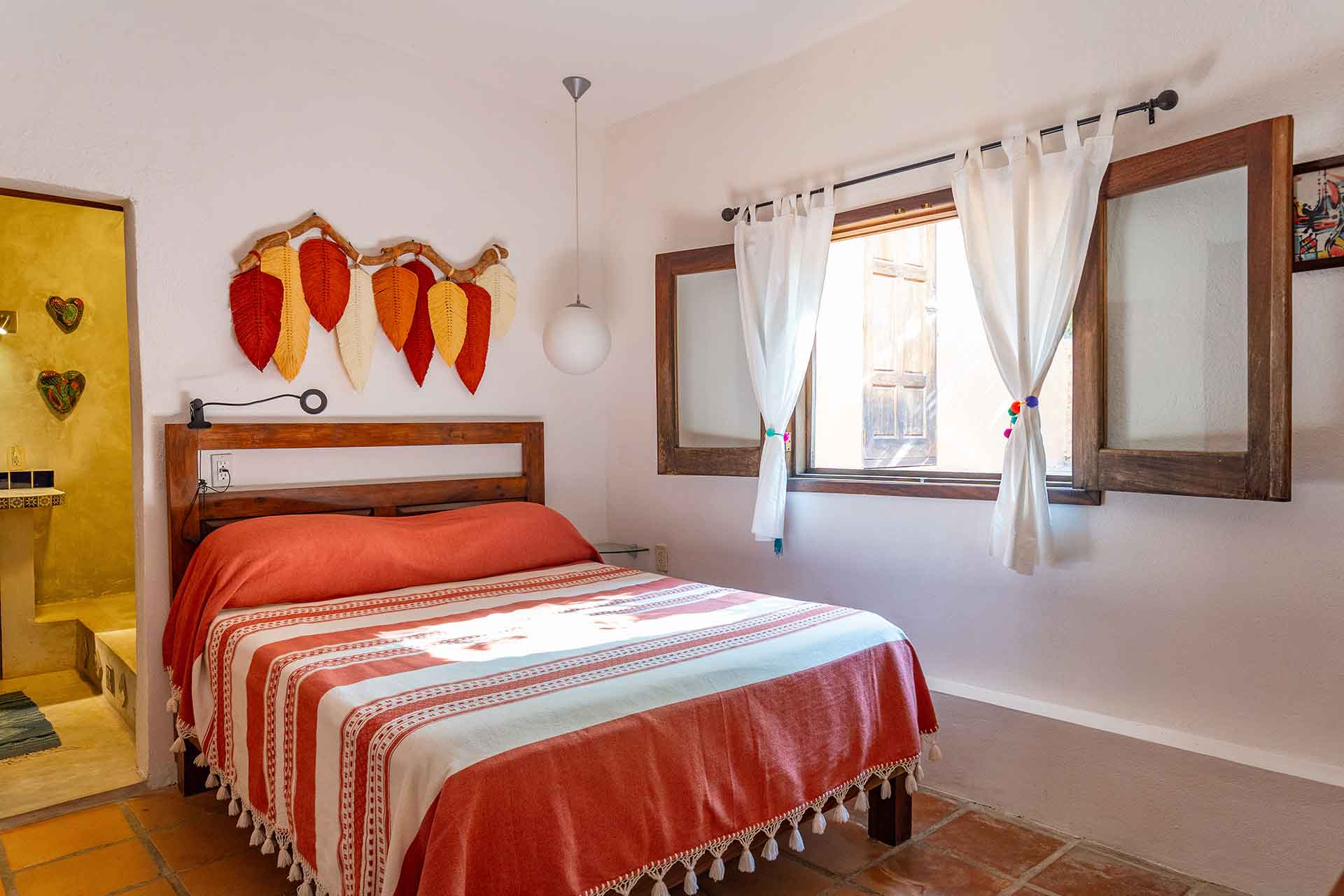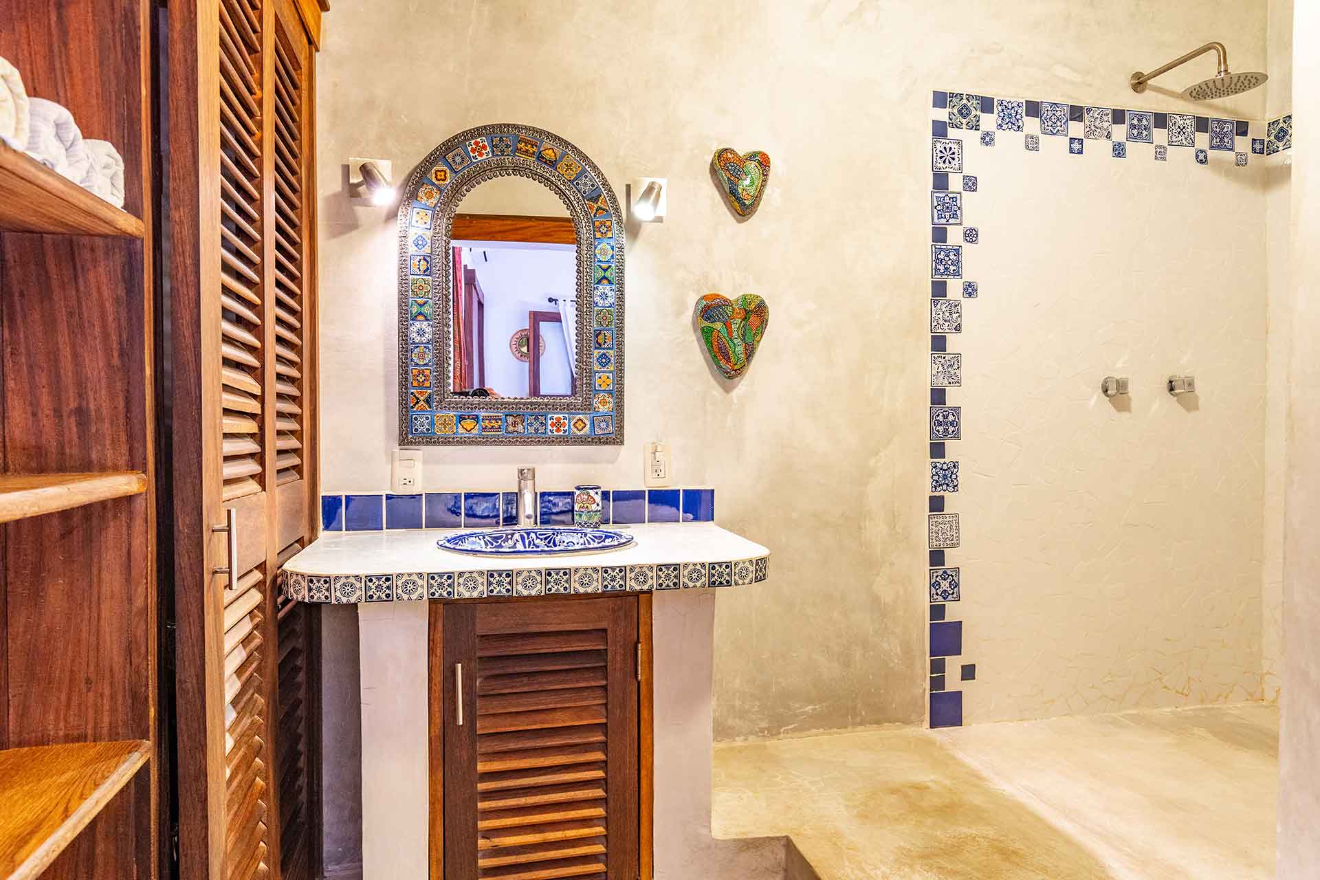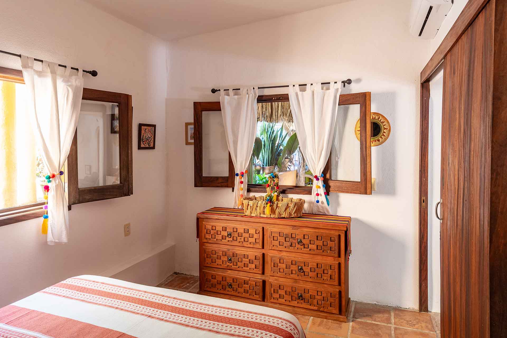 The property consists of two separate buildings with tropical rustic flair and palapa roofing throughout. The main two-story quarters hosts a living area and kitchen that connect to the back terrace and side patio area. Also on the lower level, rests the guest bedroom with queen size bed and full bathroom. The second story hosts a queen en suite bedroom under a palapa roof with a terrace. The detached cabana bedroom hosts a queen bed with full bathroom.