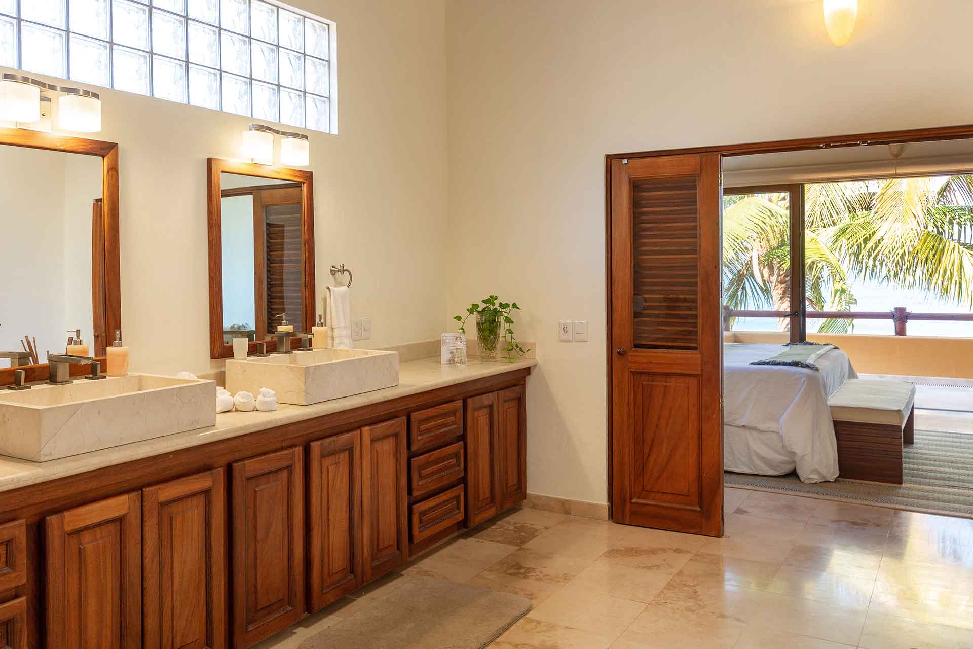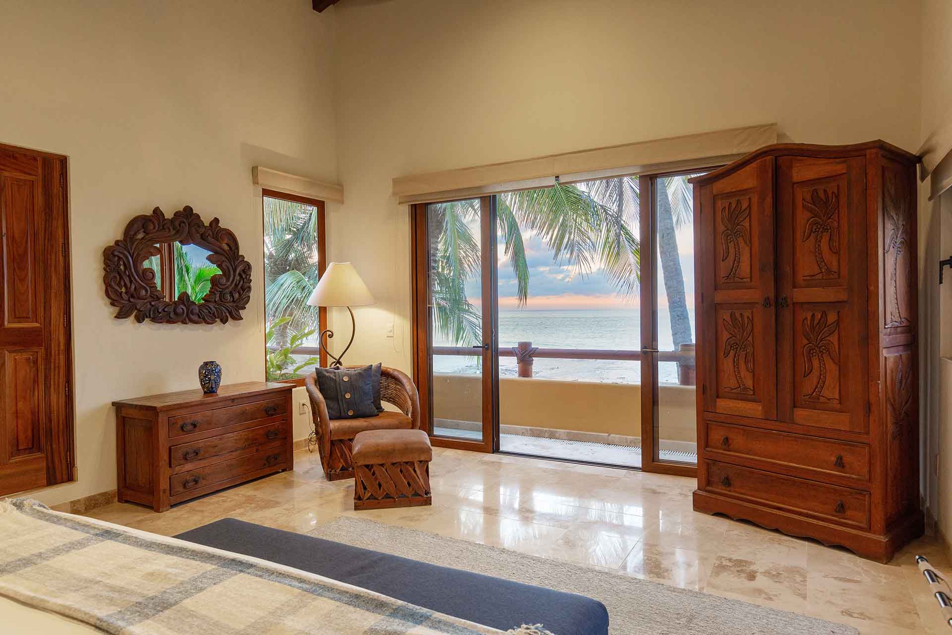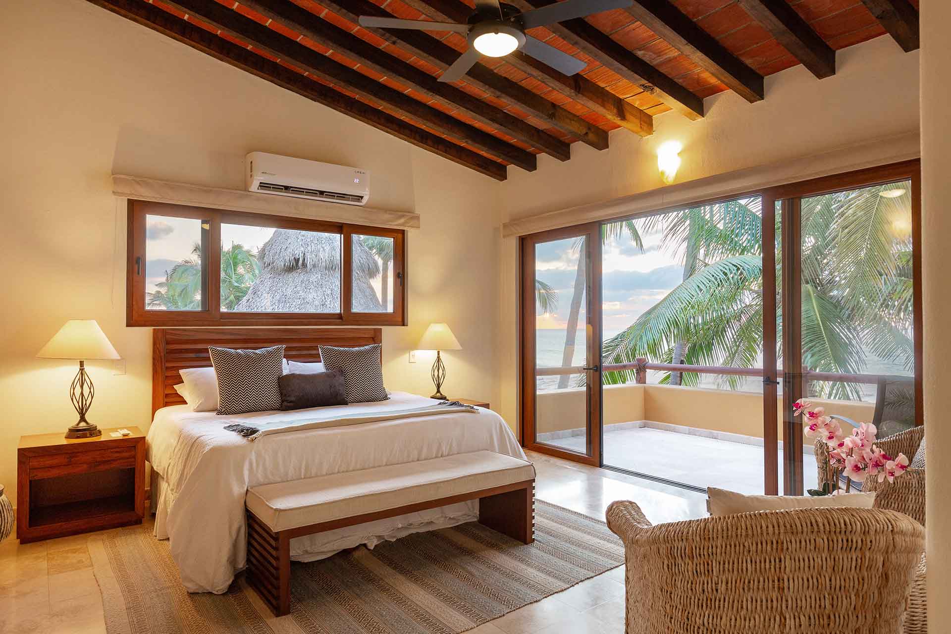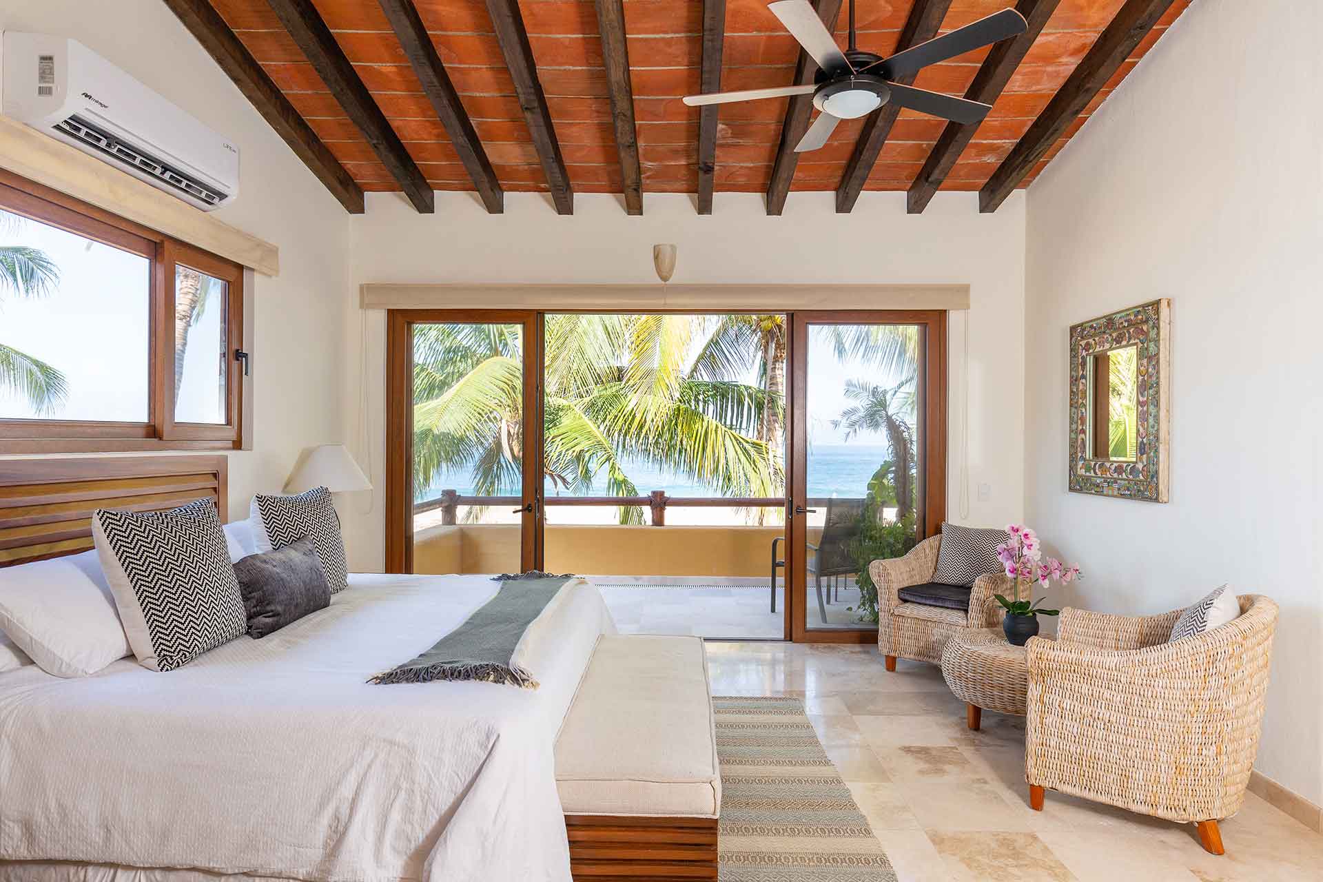 The second story contains three en-suite king bedrooms. The ocean view principal bedroom has a king size bed, sizable en-suite full bathroom and private balcony overlooking the beach. The second upstairs ocean view bedroom is equipped with a king size bed, en-suite full bathroom and private balcony overlooking the beach and palms. The third bedroom has a king size and twin size bed with an en-suite full bathroom.