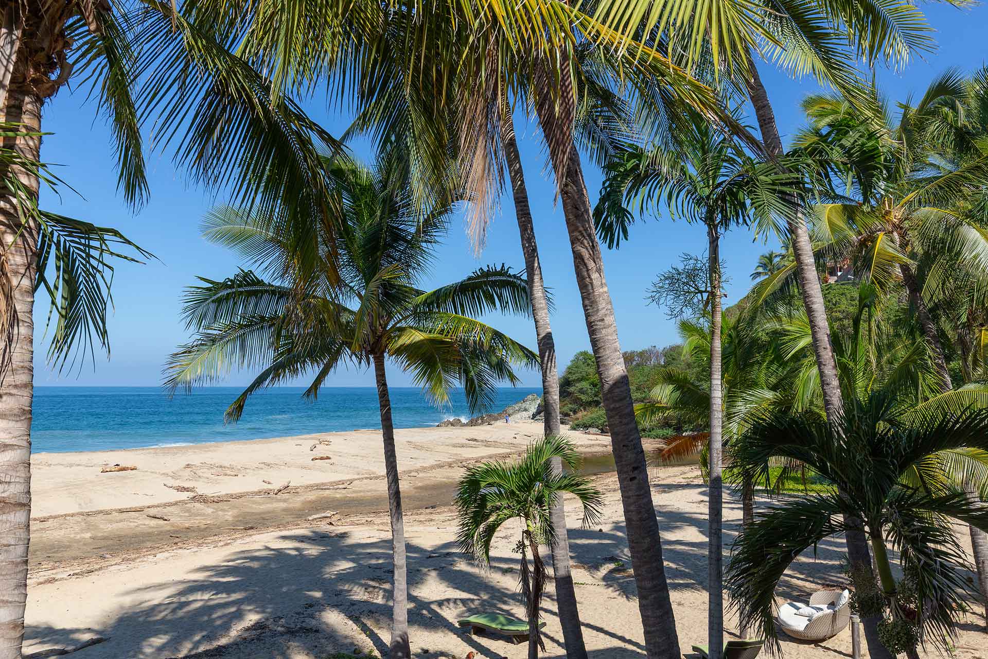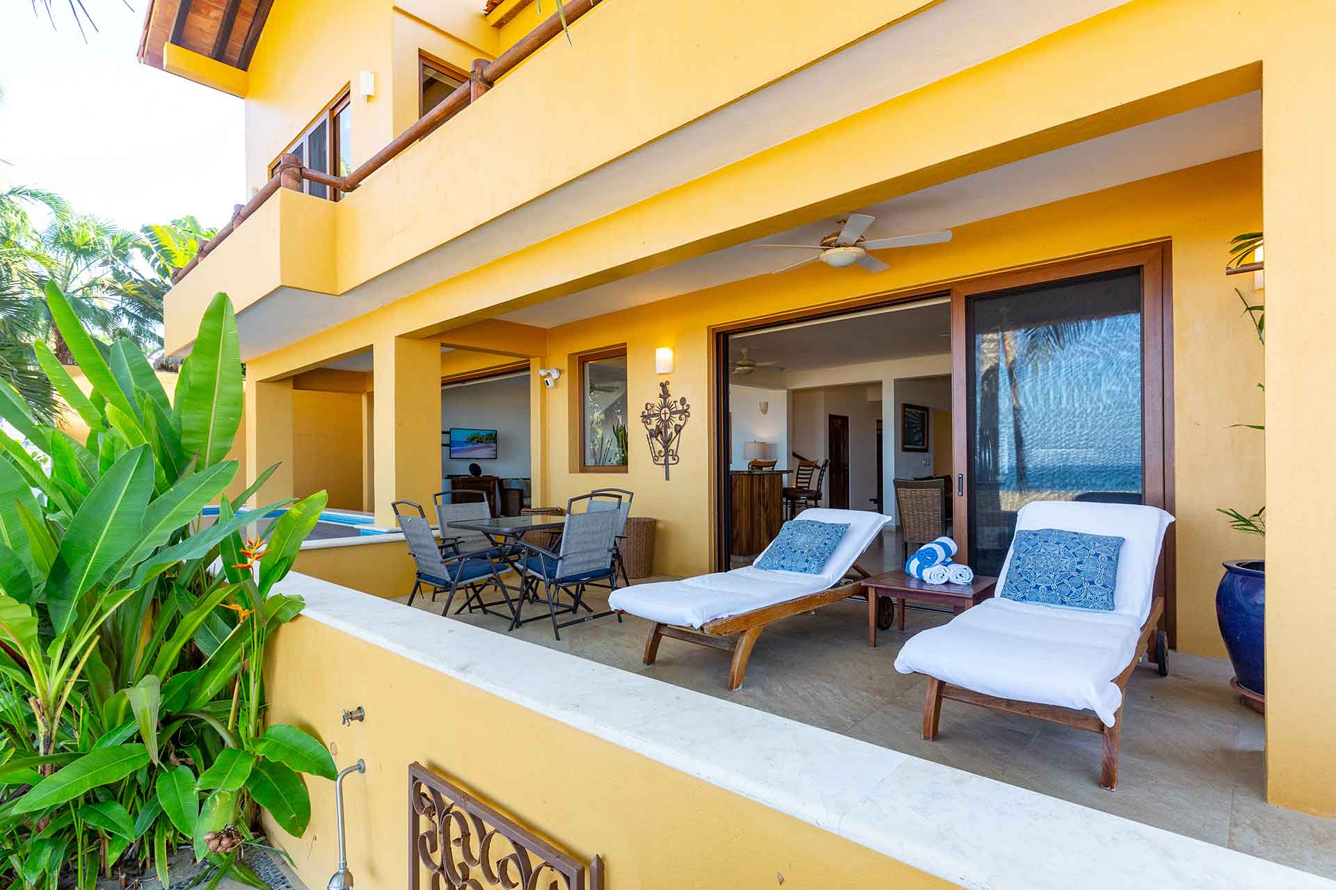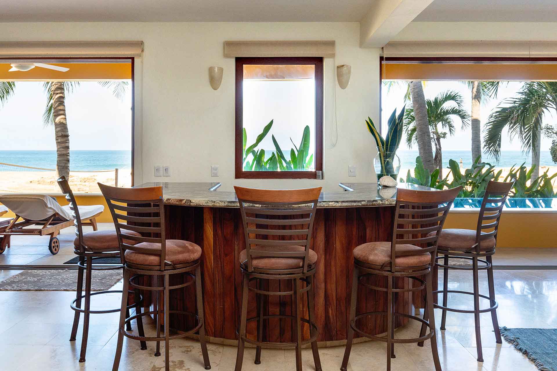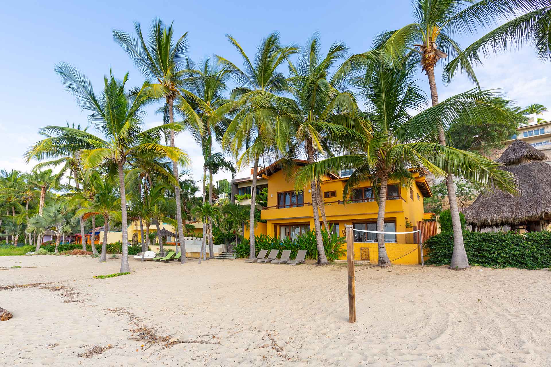 The second story contains three en-suite king bedrooms. The ocean view principal bedroom has a king size bed, sizable en-suite full bathroom and private balcony overlooking the beach. The second upstairs ocean view bedroom is equipped with a king size bed, en-suite full bathroom and private balcony overlooking the beach and palms. The third bedroom has a king size and twin size bed with an en-suite full bathroom.