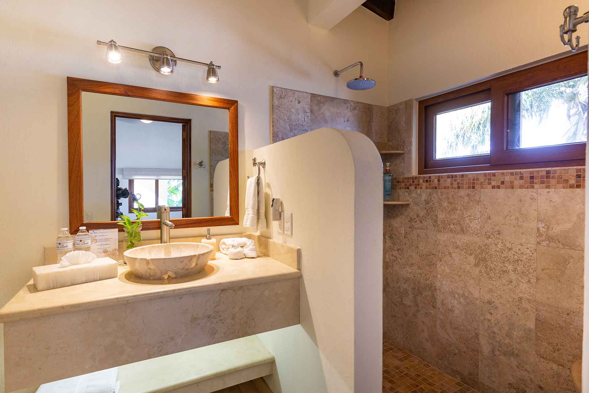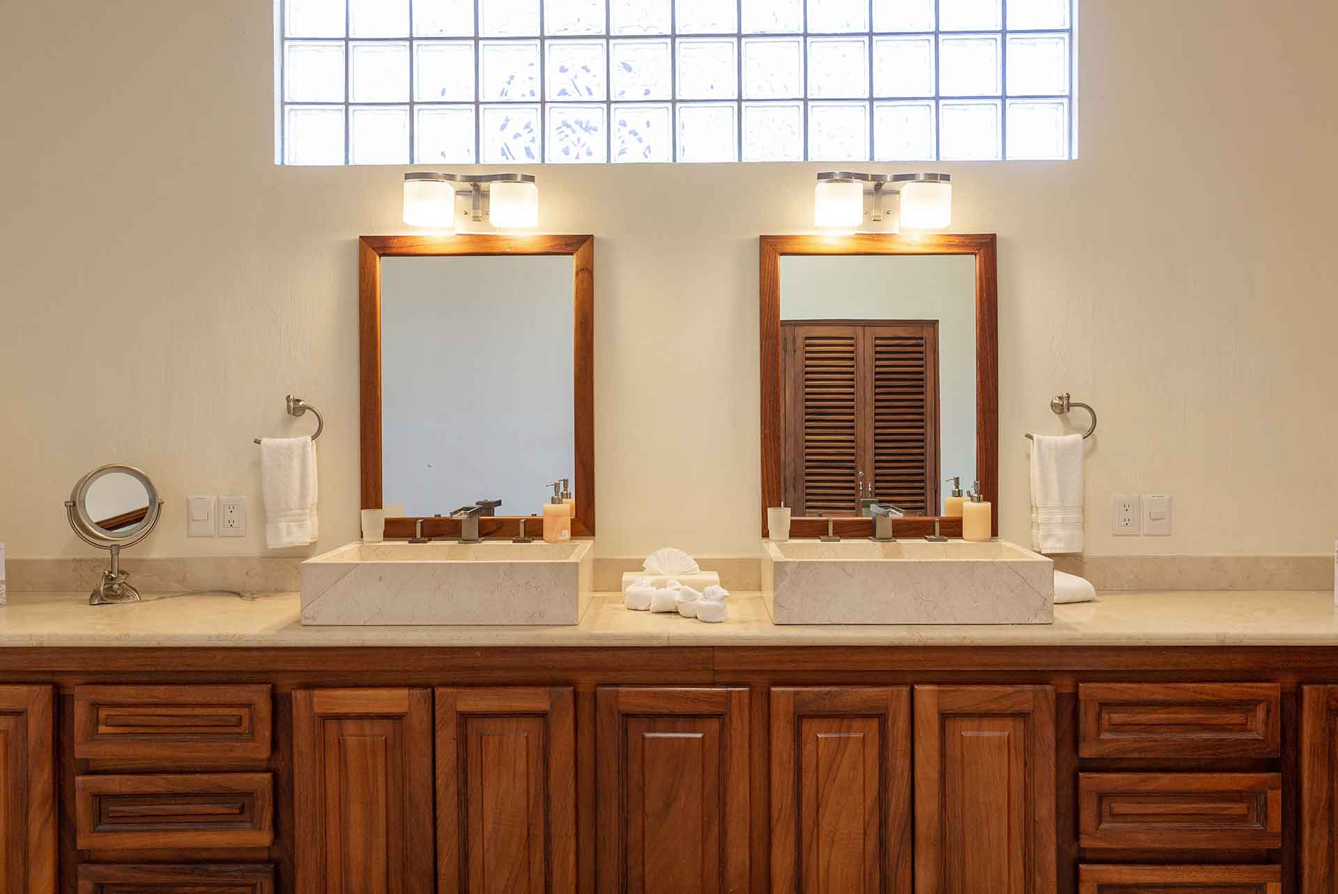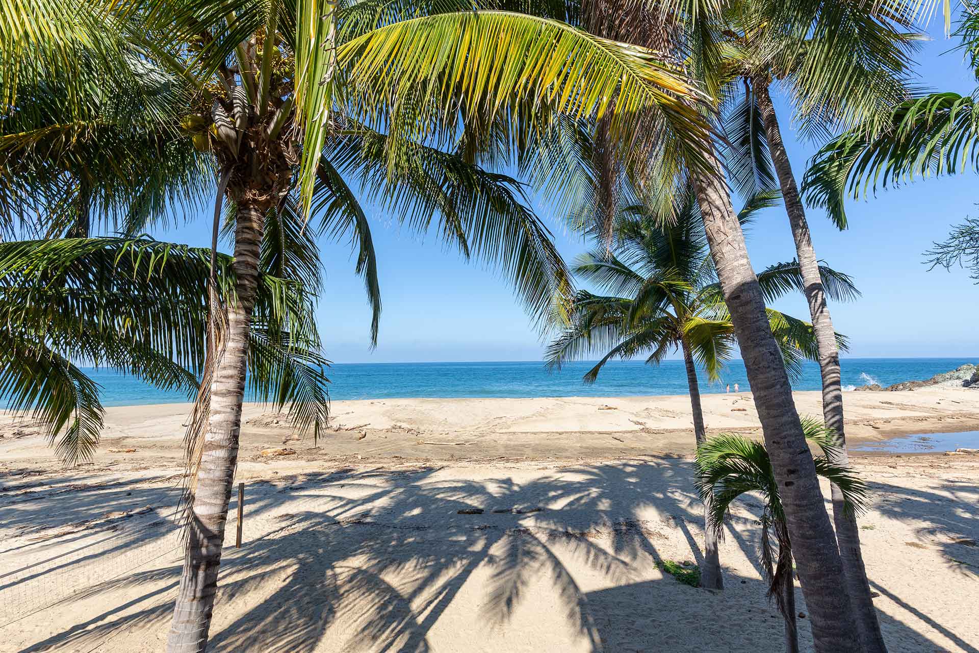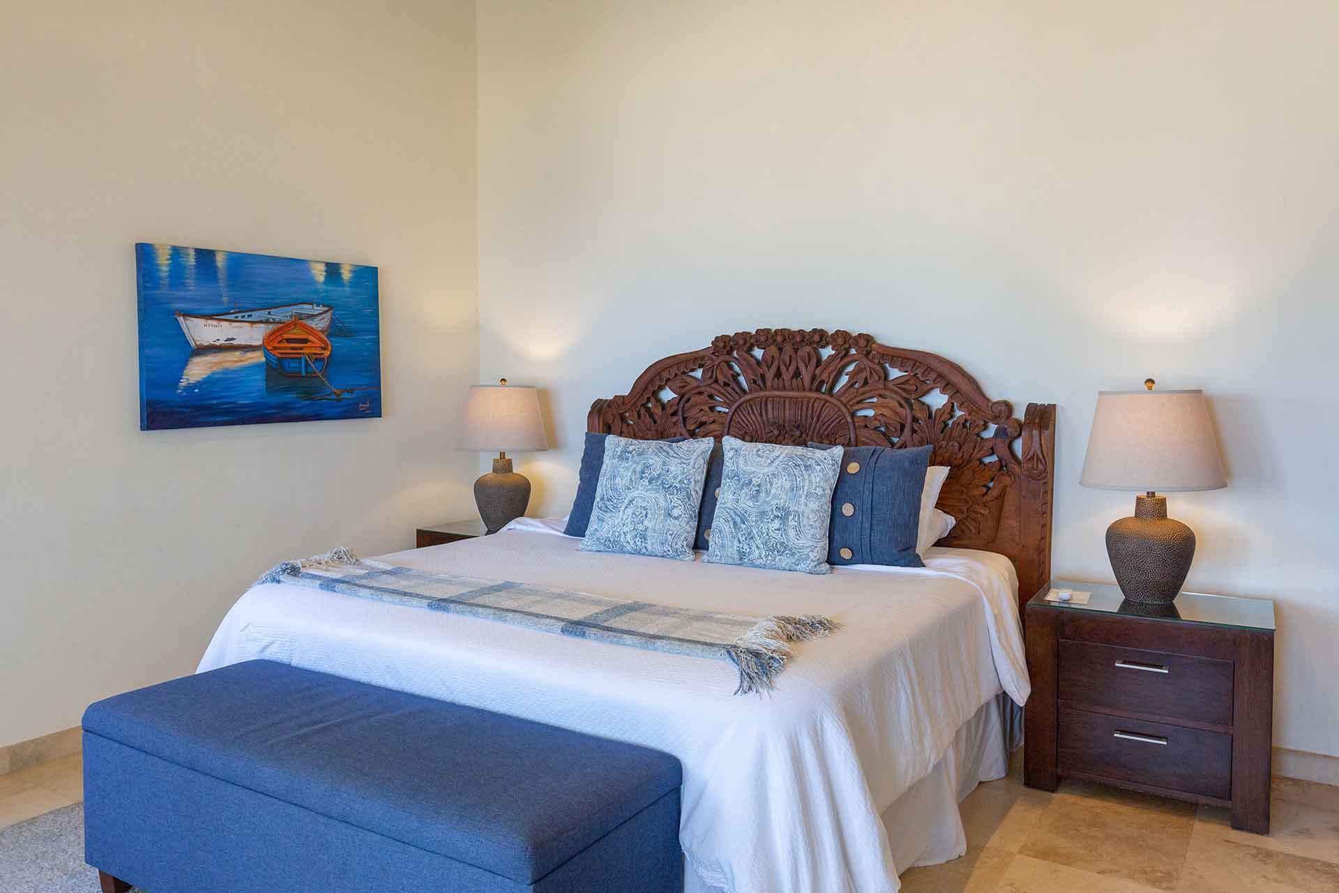 The second story contains three en-suite king bedrooms. The ocean view principal bedroom has a king size bed, sizable en-suite full bathroom and private balcony overlooking the beach. The second upstairs ocean view bedroom is equipped with a king size bed, en-suite full bathroom and private balcony overlooking the beach and palms. The third bedroom has a king size and twin size bed with an en-suite full bathroom.