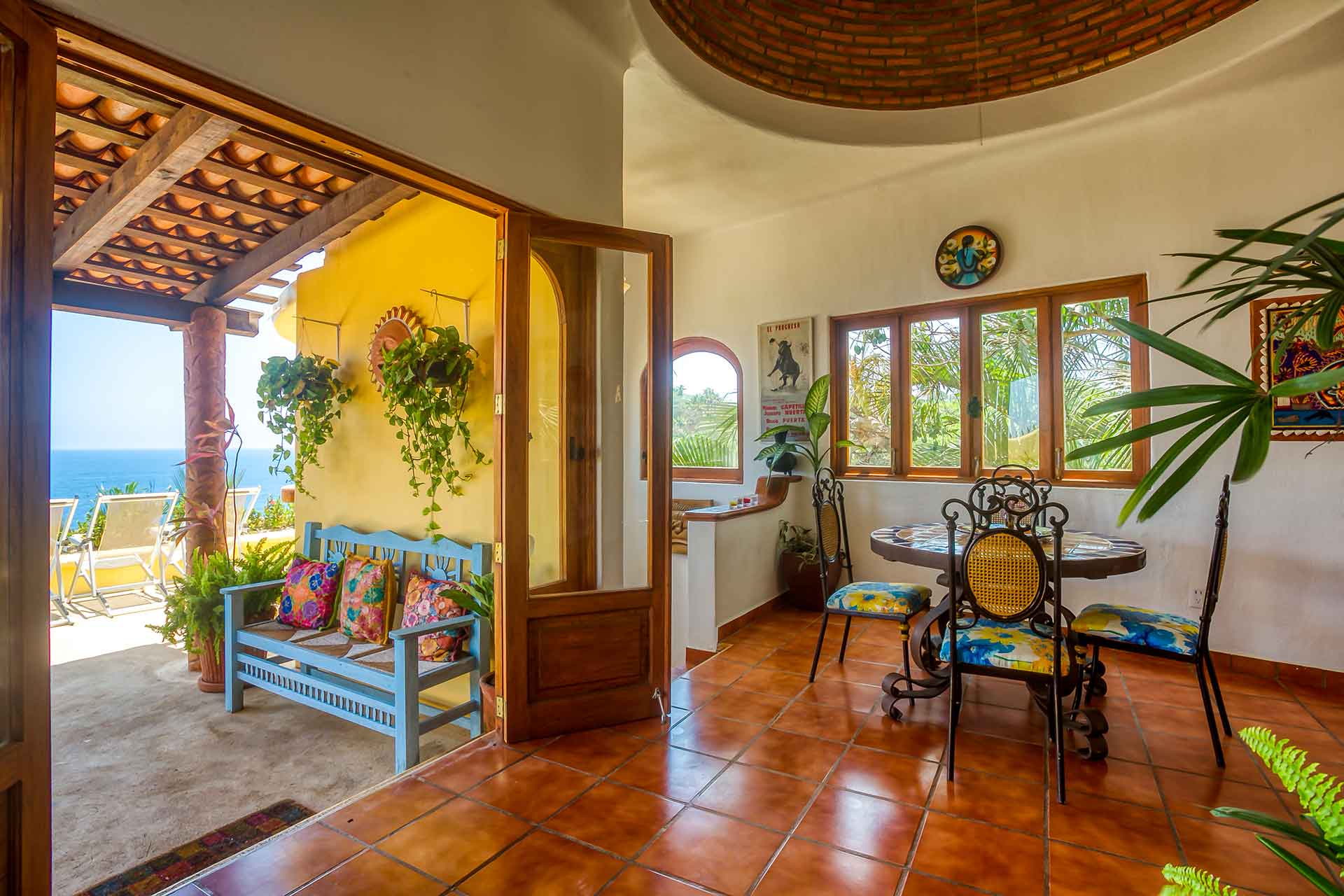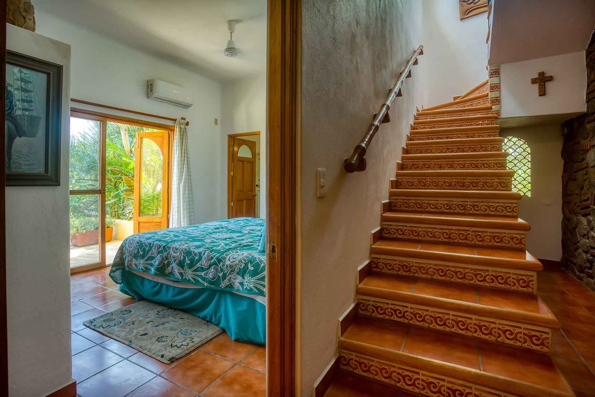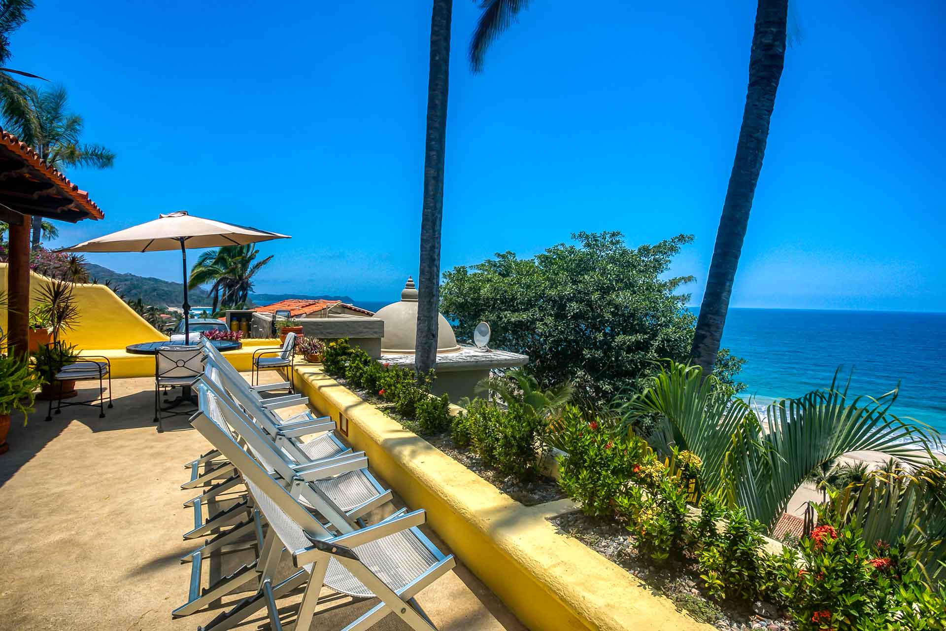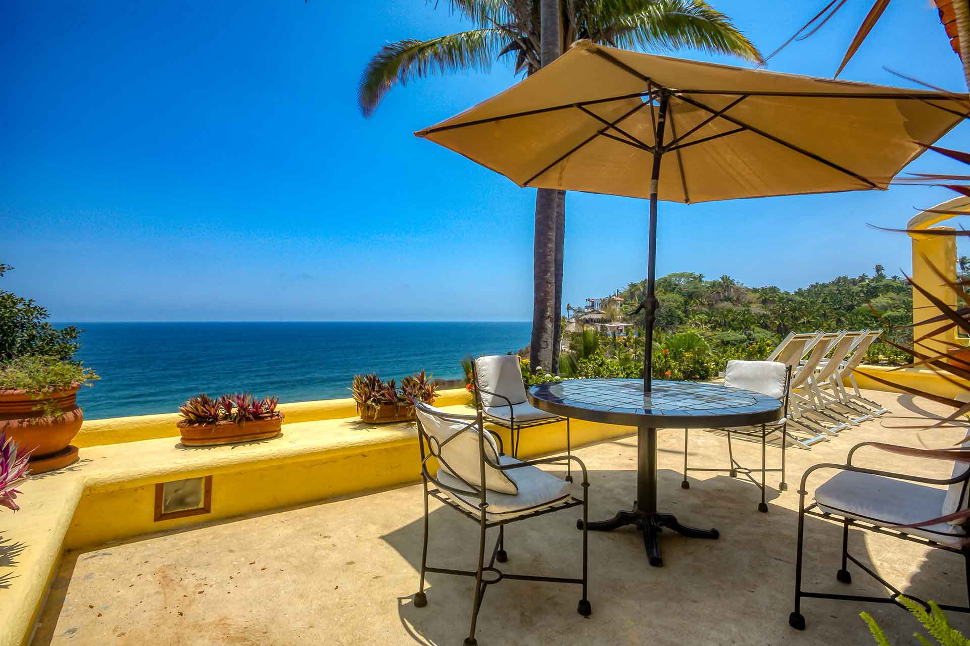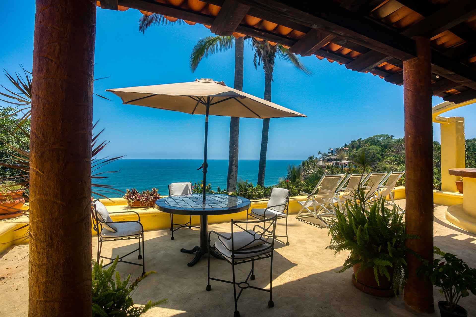 Casa Puesta del Sol (The Sunset House) is a delightful two-story home well known for its sunset terrace and charming, Mexican decor. Its hilltop location offers spectacular views of the crystal clear Pacific Ocean. The entry level hosts a full kitchen, dining area, powder room and living room with glass doors opening up to the expansive terrace. The terrace offers an outdoor bar with barbecue, a table for four and several lounge chairs where one can relax while watching the ocean waves fall on the beach below.