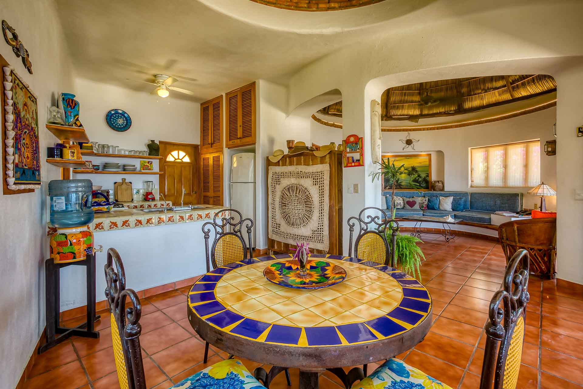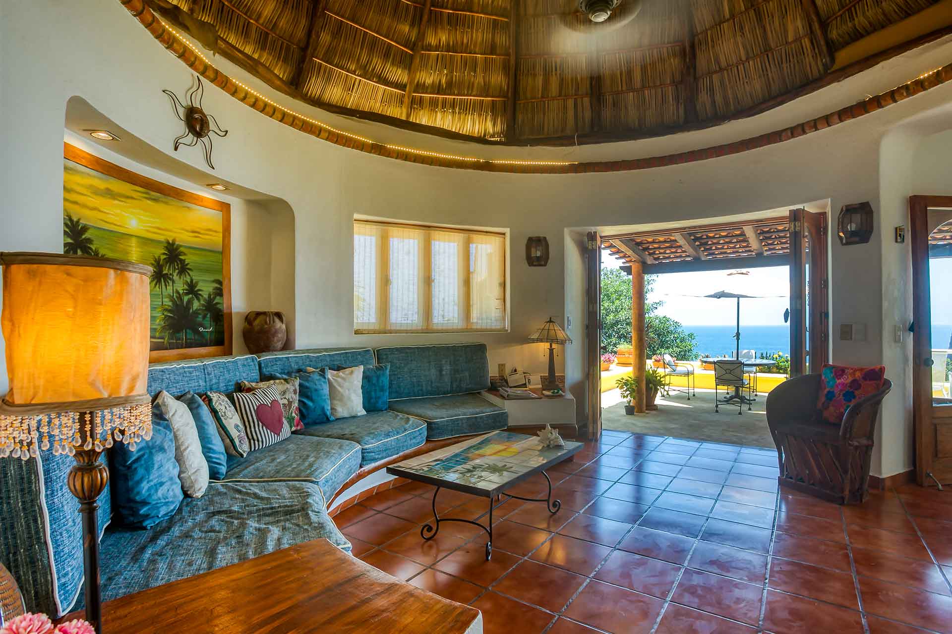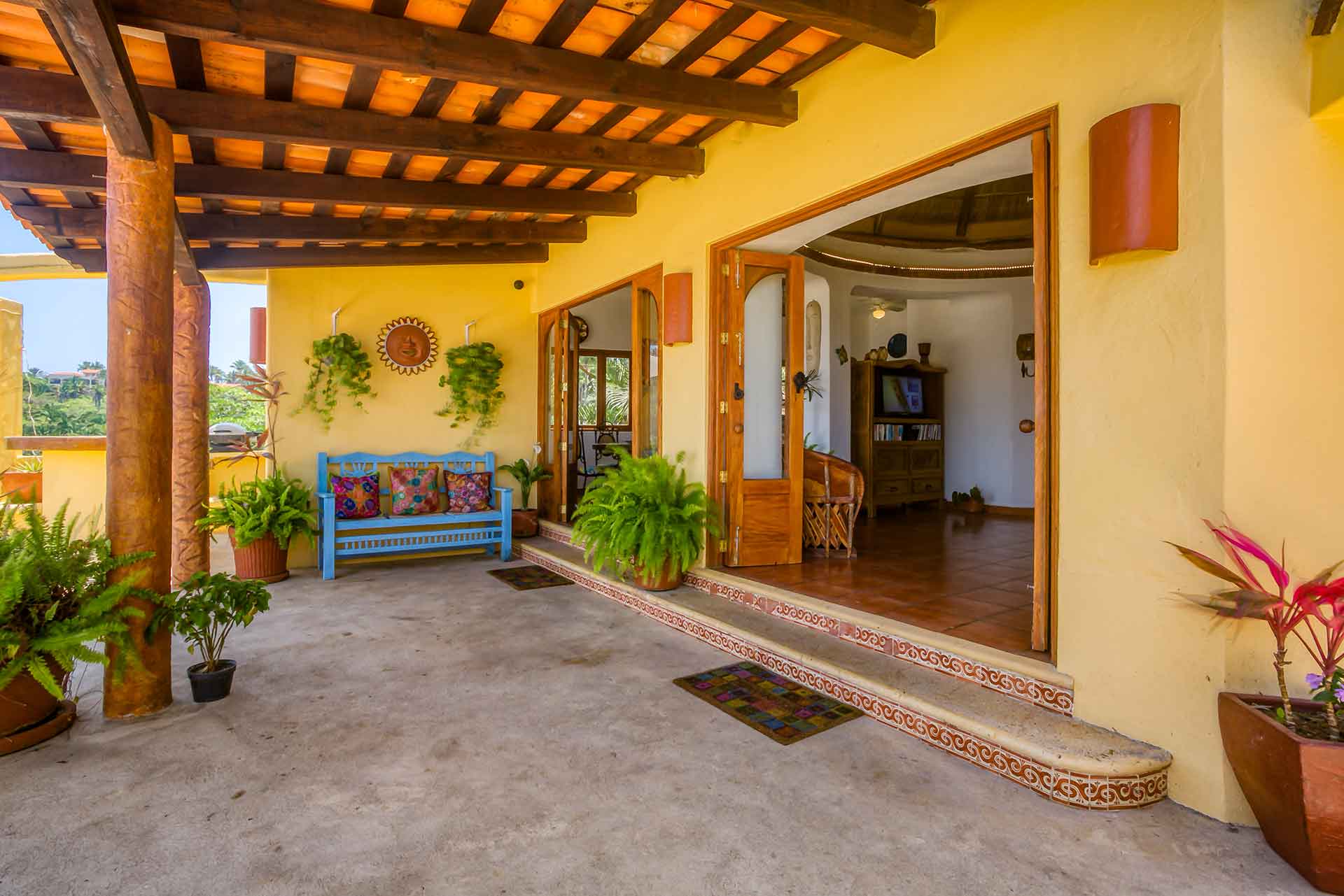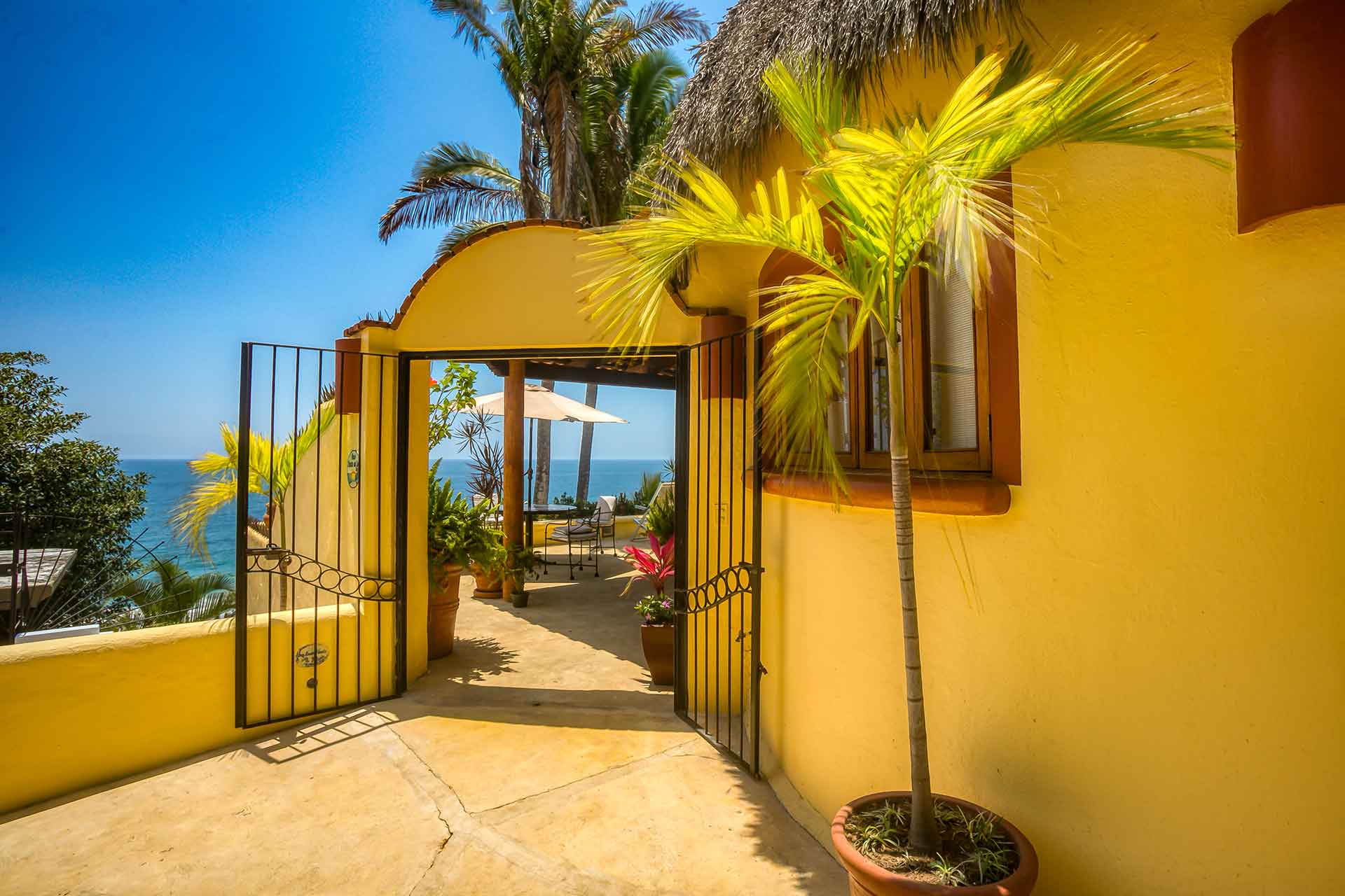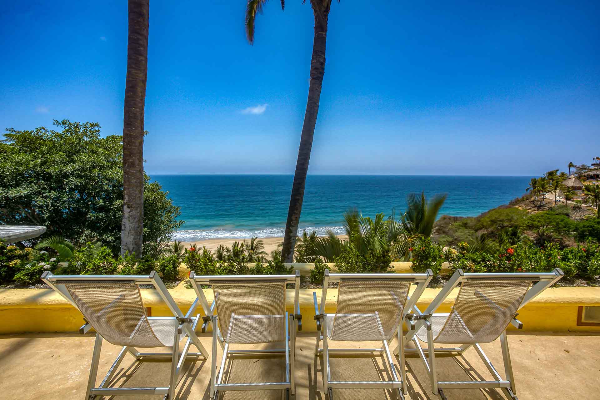 Casa Puesta del Sol (The Sunset House) is a delightful two-story home well known for its sunset terrace and charming, Mexican decor. Its hilltop location offers spectacular views of the crystal clear Pacific Ocean. The entry level hosts a full kitchen, dining area, powder room and living room with glass doors opening up to the expansive terrace. The terrace offers an outdoor bar with barbecue, a table for four and several lounge chairs where one can relax while watching the ocean waves fall on the beach below.