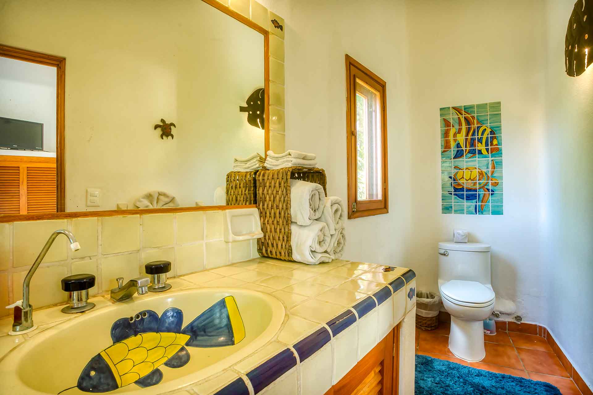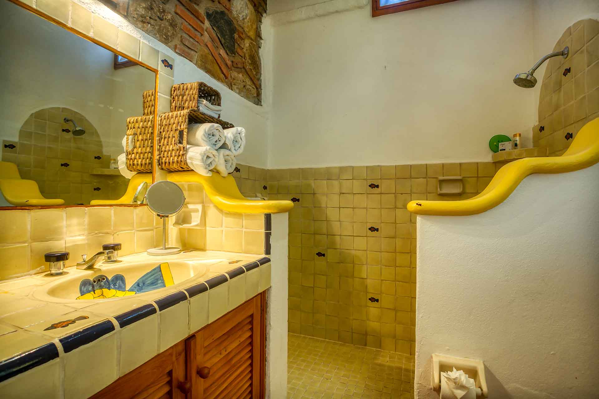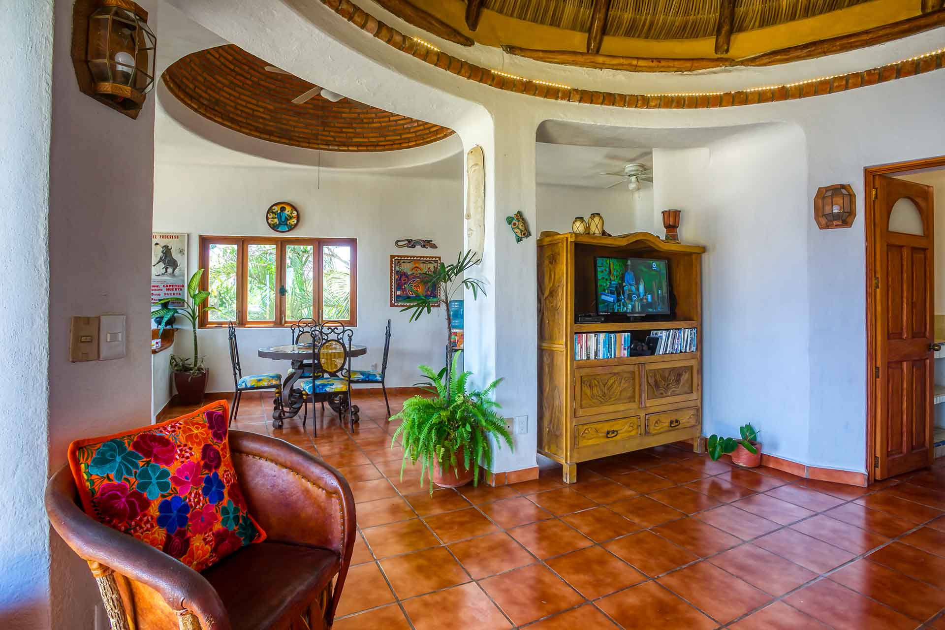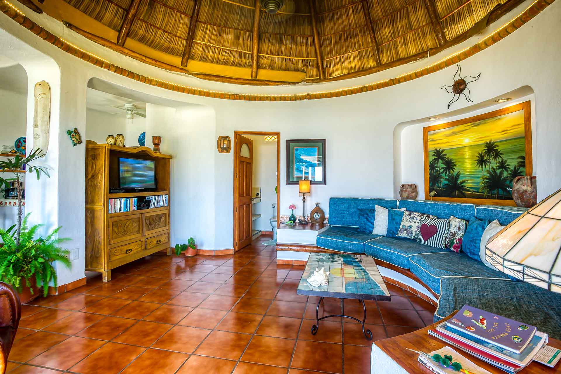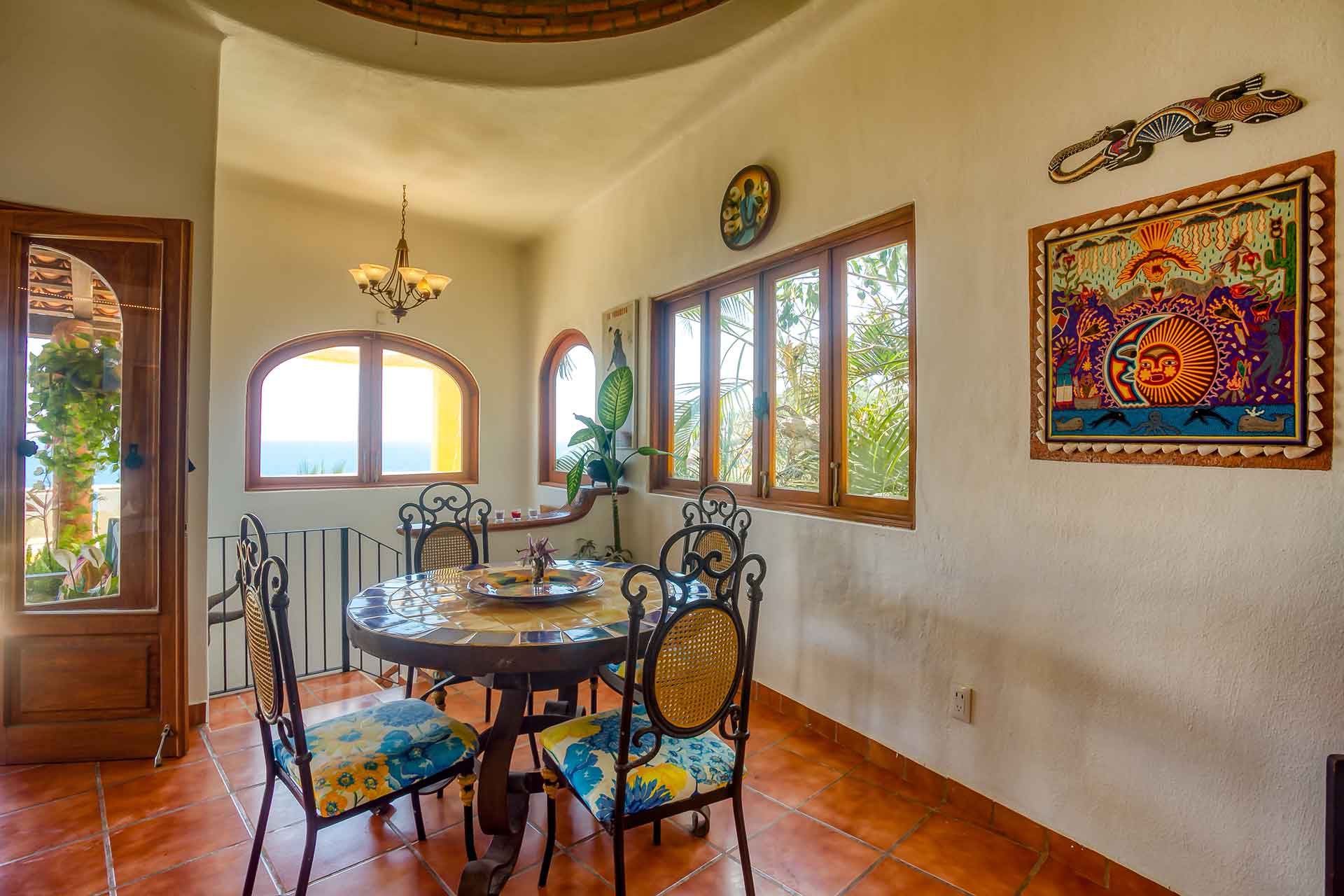Casa Puesta del Sol (The Sunset House) is a delightful two-story home well known for its sunset terrace and charming, Mexican decor. Its hilltop location offers spectacular views of the crystal clear Pacific Ocean. The entry level hosts a full kitchen, dining area, powder room and living room with glass doors opening up to the expansive terrace. The terrace offers an outdoor bar with barbecue, a table for four and several lounge chairs where one can relax while watching the ocean waves fall on the beach below.
