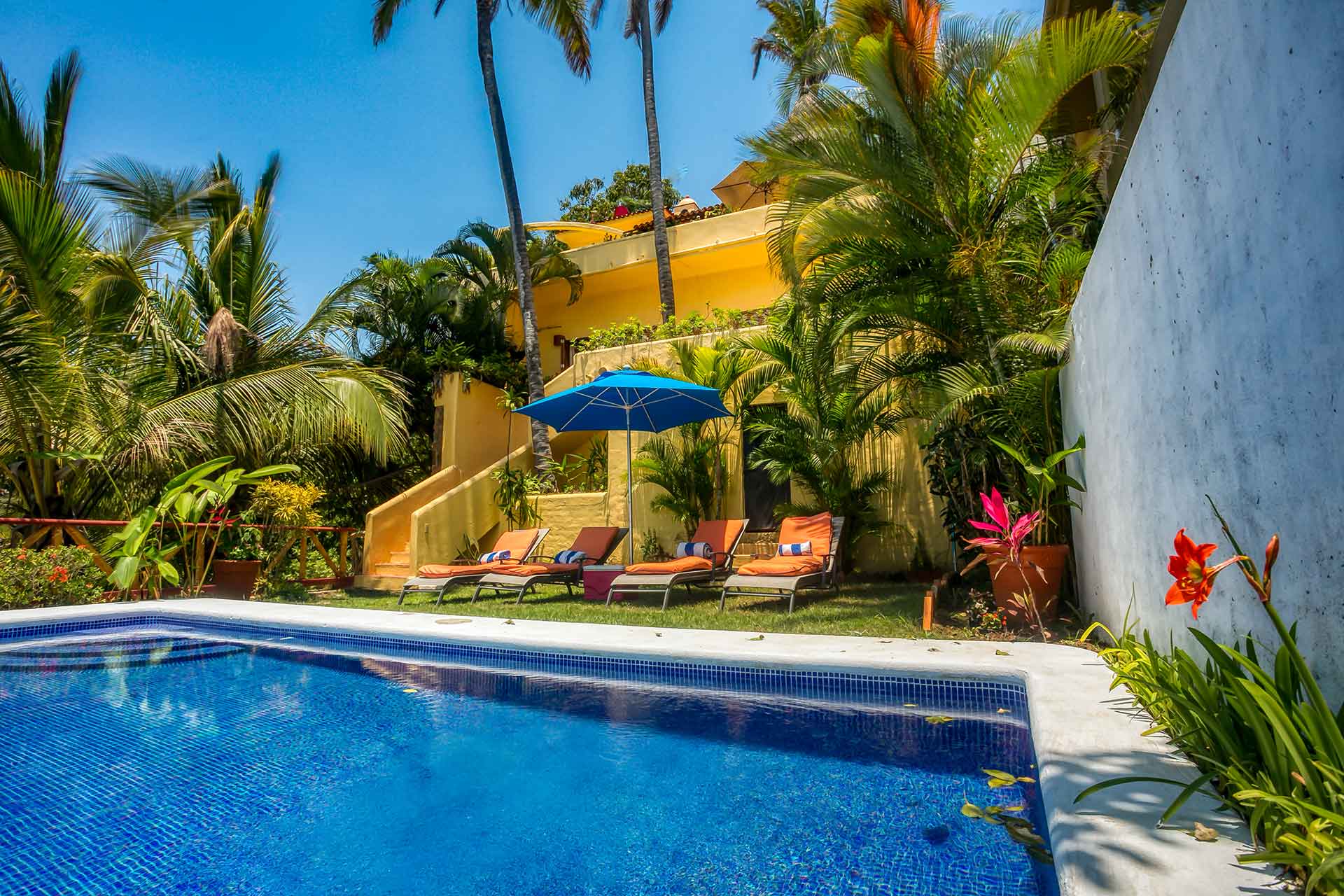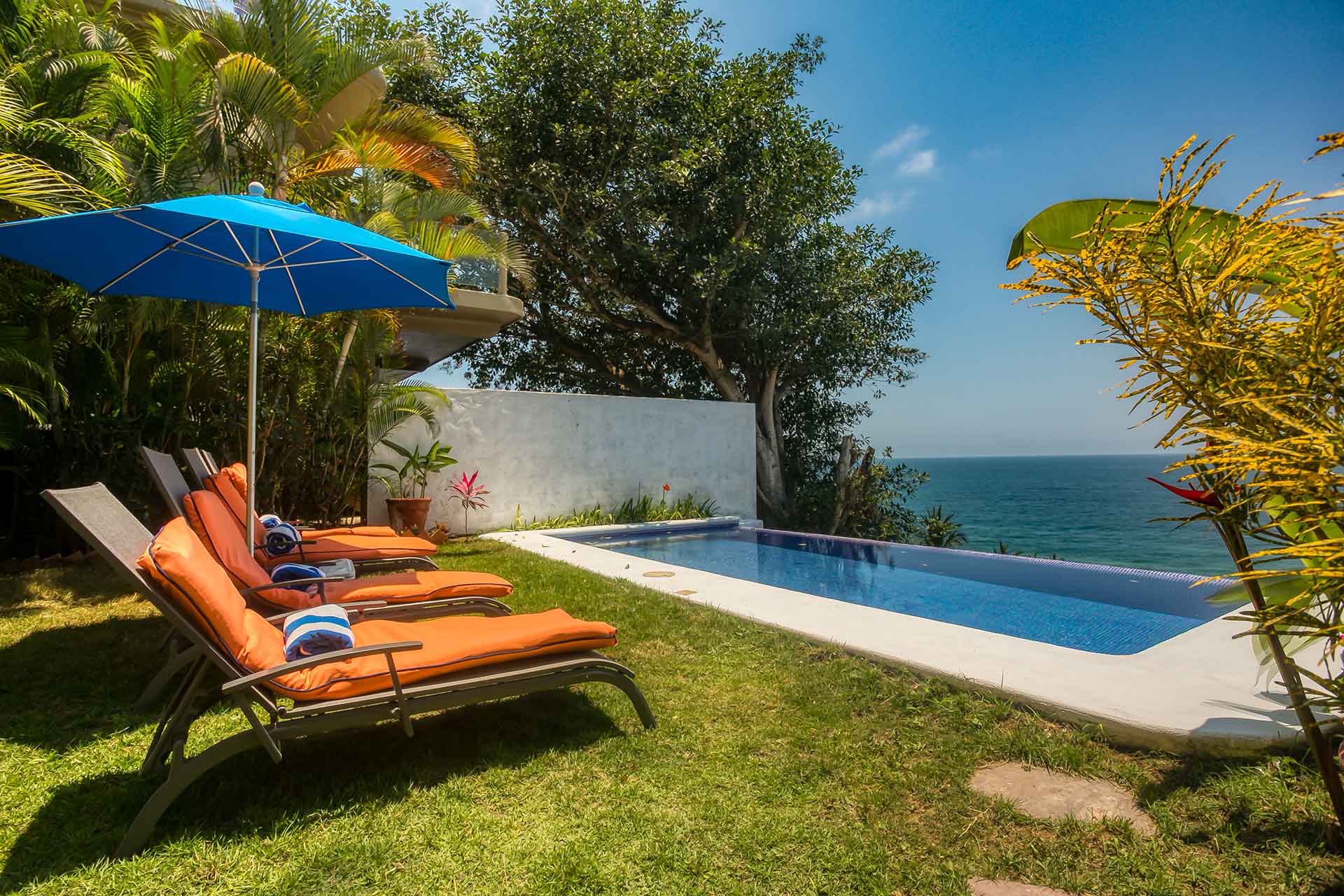 The downstairs level consists of two en-suite bedrooms. Each bedroom has a private bath, air-conditioning and sliding doors opening out to yet another terrace with spectacular ocean views. From there, steps lead down to the ocean view pool surrounded by a grassy patio area with umbrellas and lounge chairs.