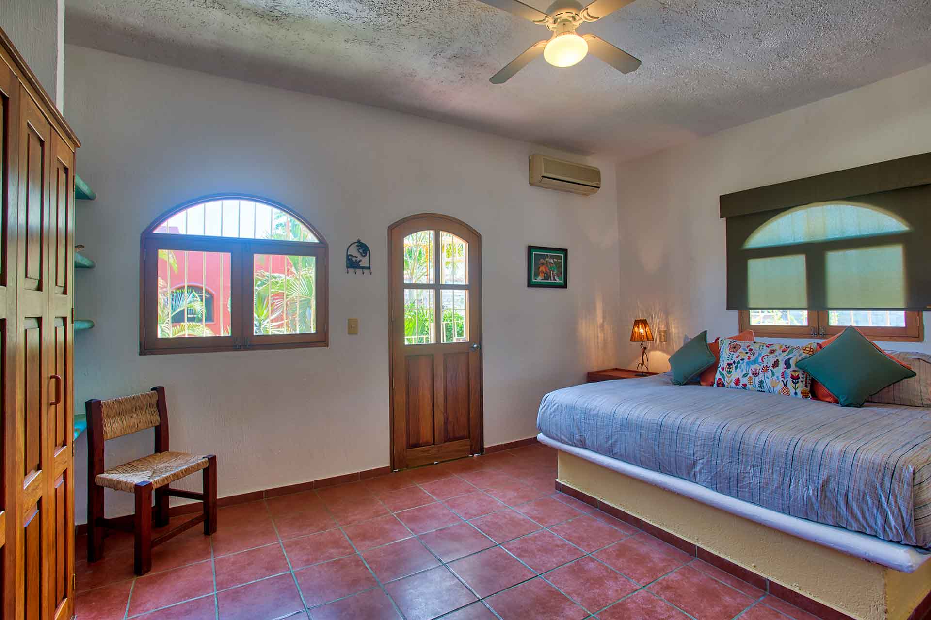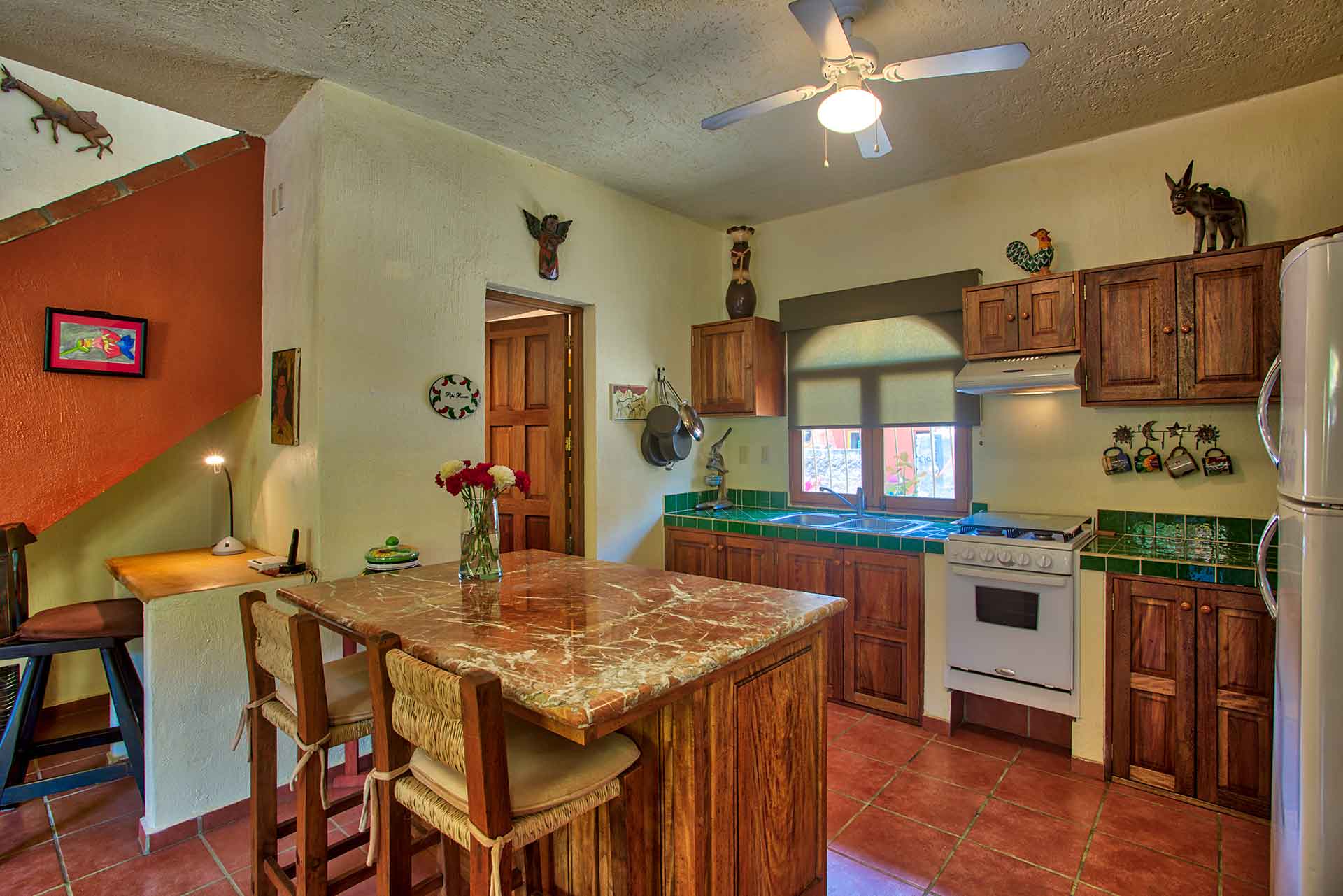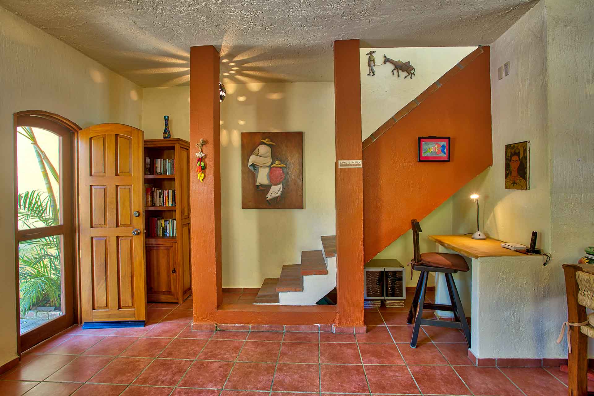 Nestled in the botanical haven of Villa Tres Amores, Casa Siggy is one of three cozy, two-bedroom, two-bathroom, two-story homes, within an eight minute walk through the charming village of San Pancho to the much sought-after Riviera Nayarit beach. Casa Siggy consists of 900 plus square feet of air conditioned living space (although the overhead fans are always available to move natural air during the winter when air conditioning is rarely needed). The ground level has an open-concept full kitchen and living area, with an adjacent bathroom that boasts a classically Mexican tiled sink and shower. Upstairs, the second floor hosts two bedrooms and a full bathroom. One bedroom contains a queen bed and the other bedroom a king. From this level an outdoor spiral staircase winds its way up to the private rooftop terrace with it’s heart expanding views of the surrounding neighborhood, countryside, sunrises and sunsets.