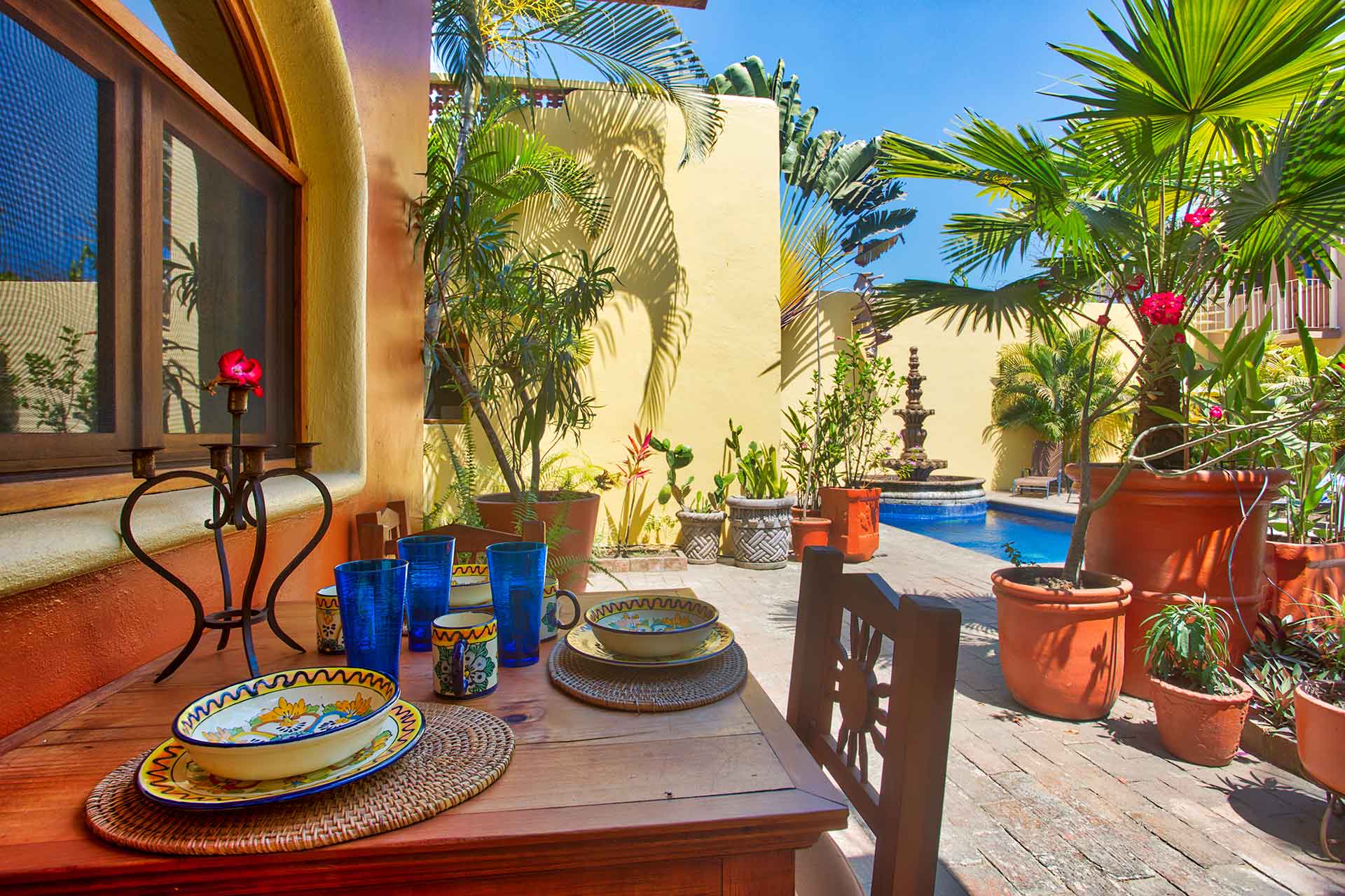 Casa Siggy and the other two private homes are part of a compound, Villa Tres Amores, the concept behind the layout was to include areas grand enough to allow all of the guests to come together and smaller enclaves cozy enough to engage in those all-important intimate conversations and private moments. All of the homes share the luscious courtyard with pool, cascading fountain and outdoor kitchen complete with BBQ and a large dining table situated beneath a romantic vine trellis. Although, each home hosts a private rooftop terrace, there is another communal rooftop terrace complete with raspberry-colored bougainvillea overhead canopy.