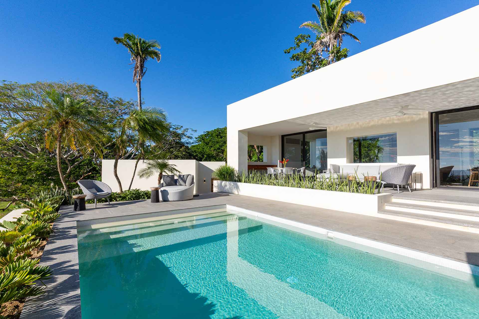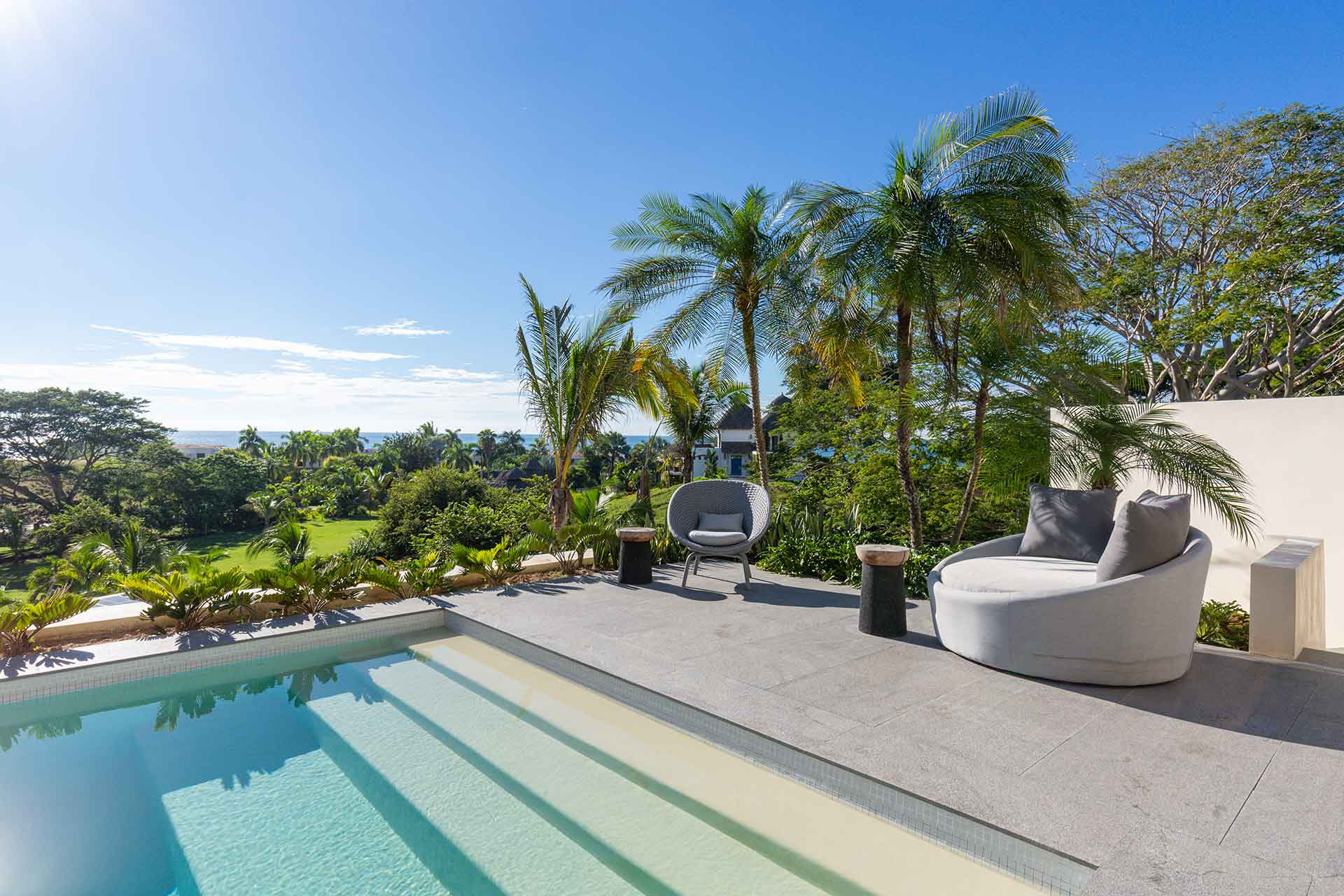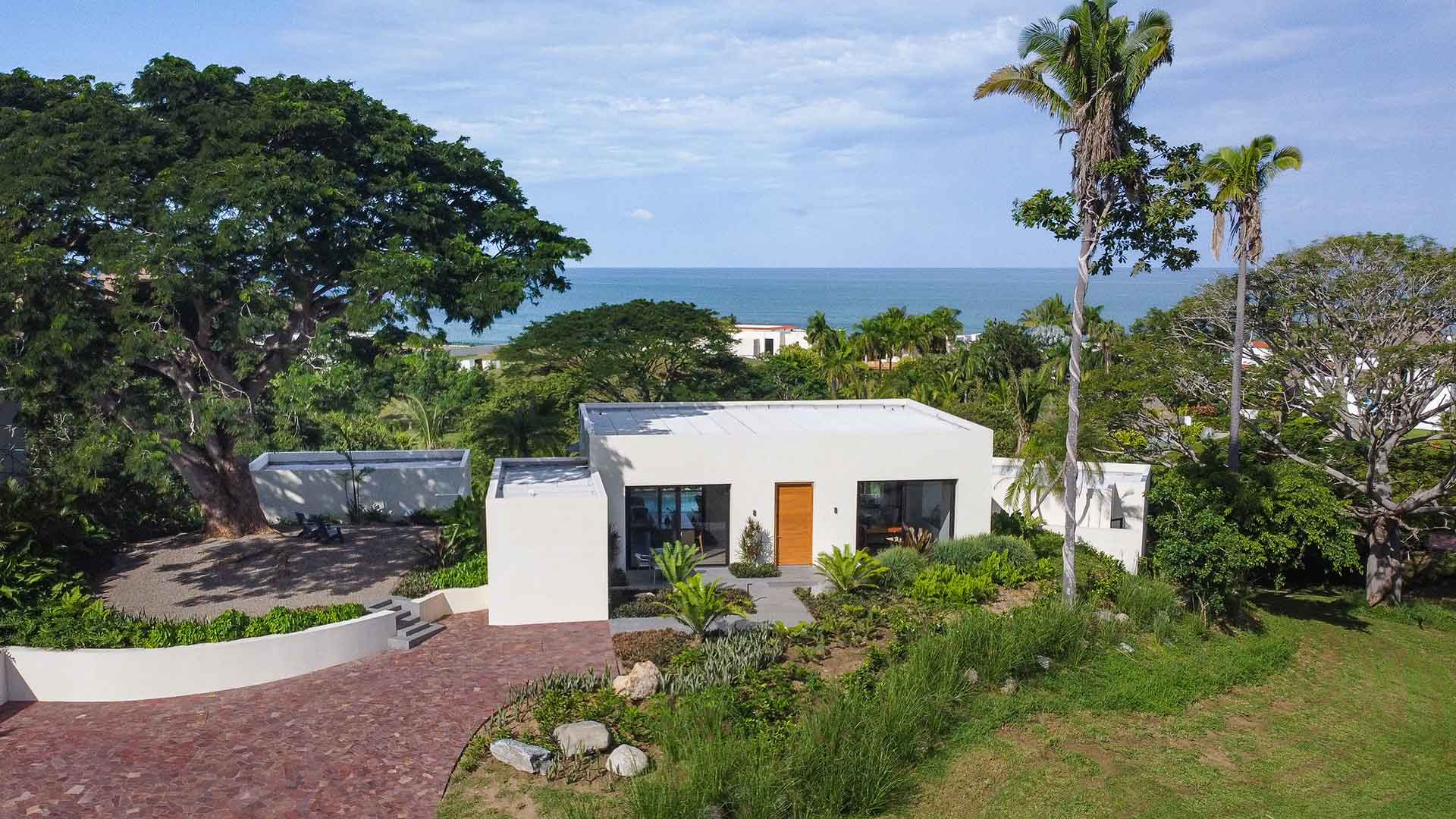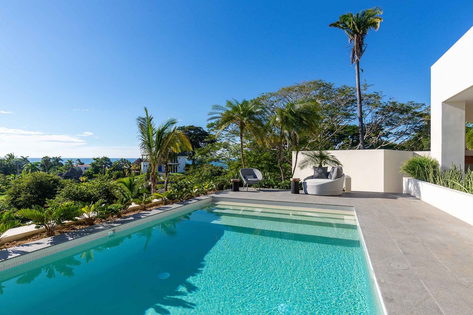 Casa Vista is one of San Pancho’s newest editions, hosting expansive views of the Pacific Ocean and lush tropical jungle, while just steps to the beach and conveniently located near the town center. Upon entering the grounds, one is immediately encompassed in the well-manicured gardens. The private parking leads to the entrance level with a fully air conditioned, open concept living area, dining room and kitchen, all of which lead out the ocean view terrace with heated swimming pool. On either side of the pool, steps lead to the air-conditioned, en-suite king bedrooms.