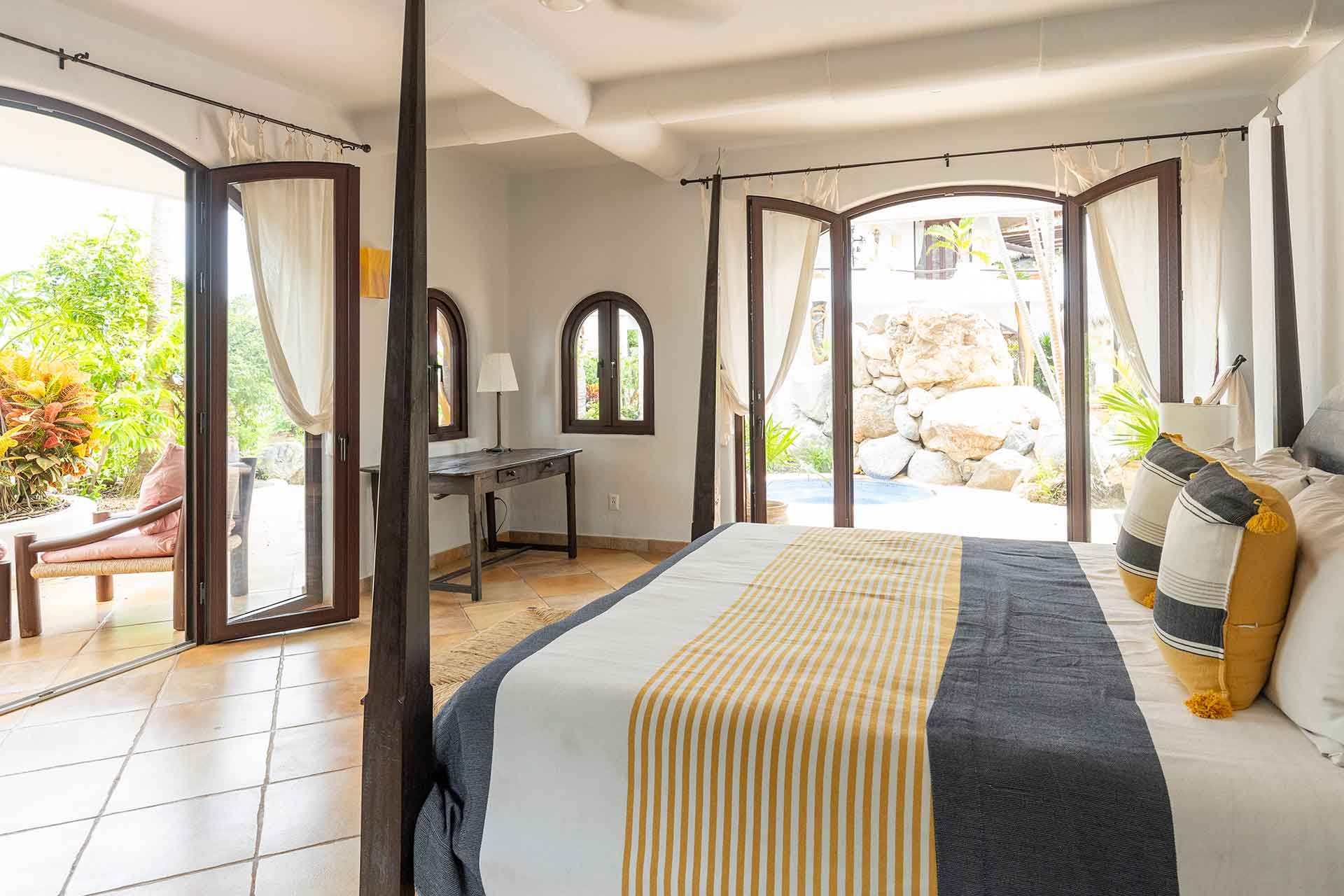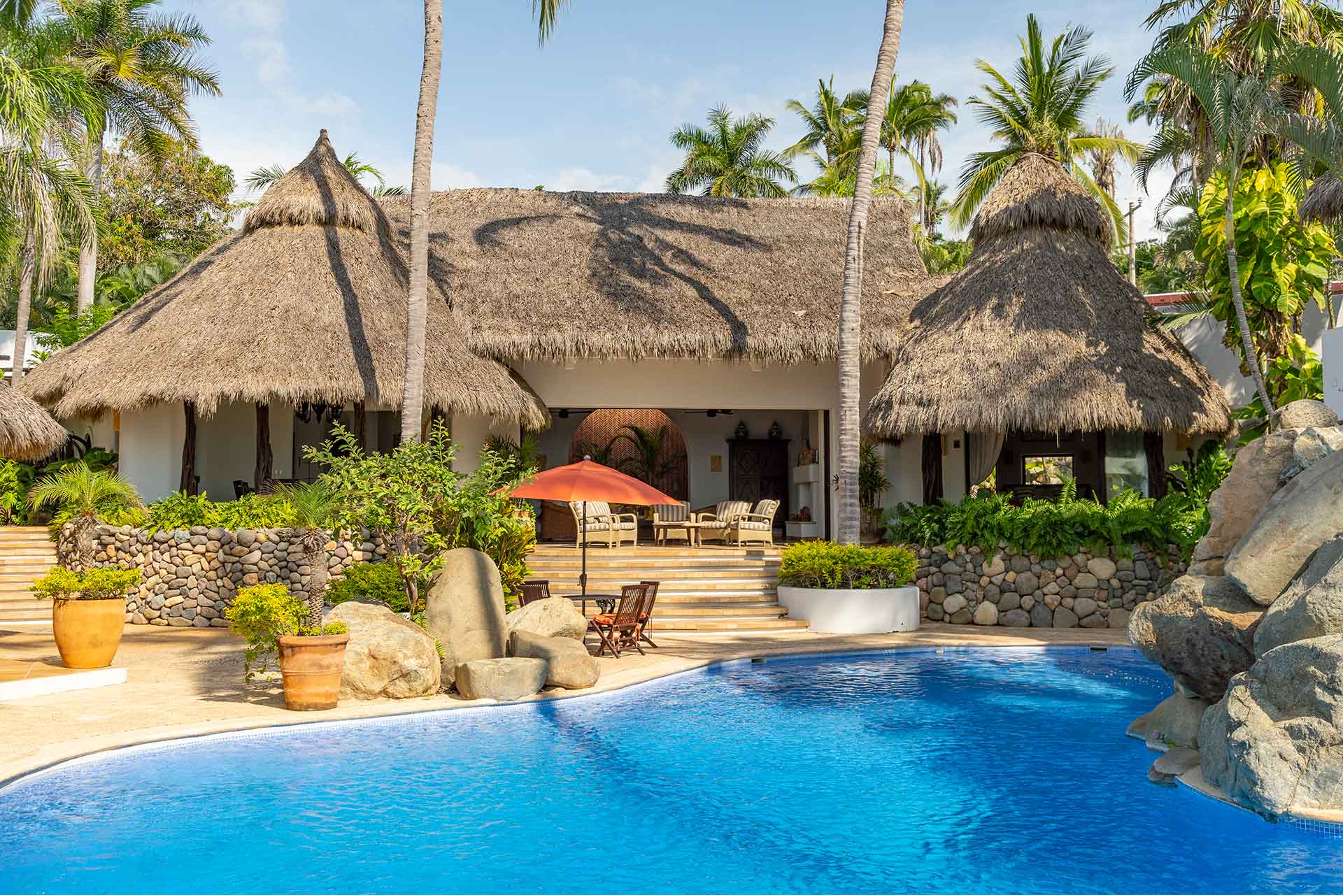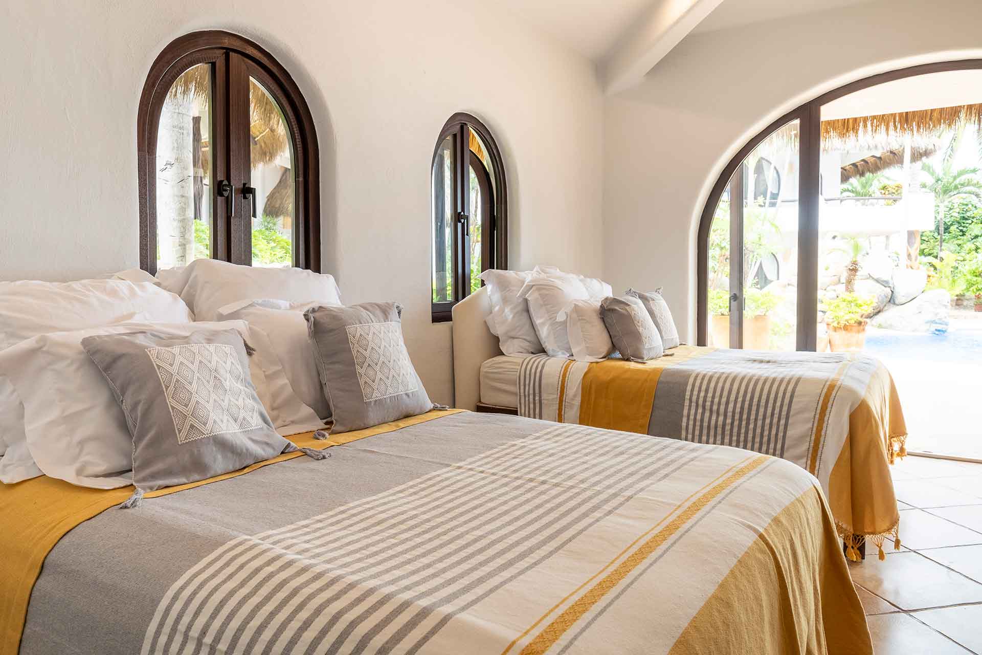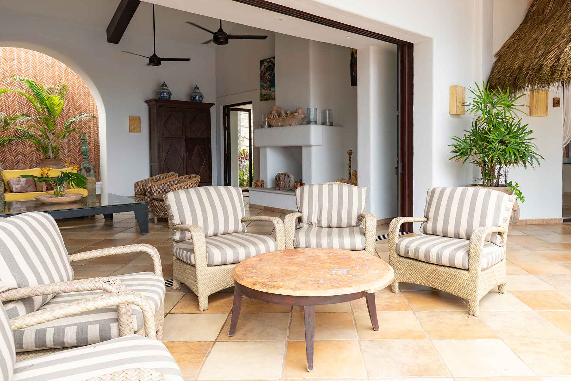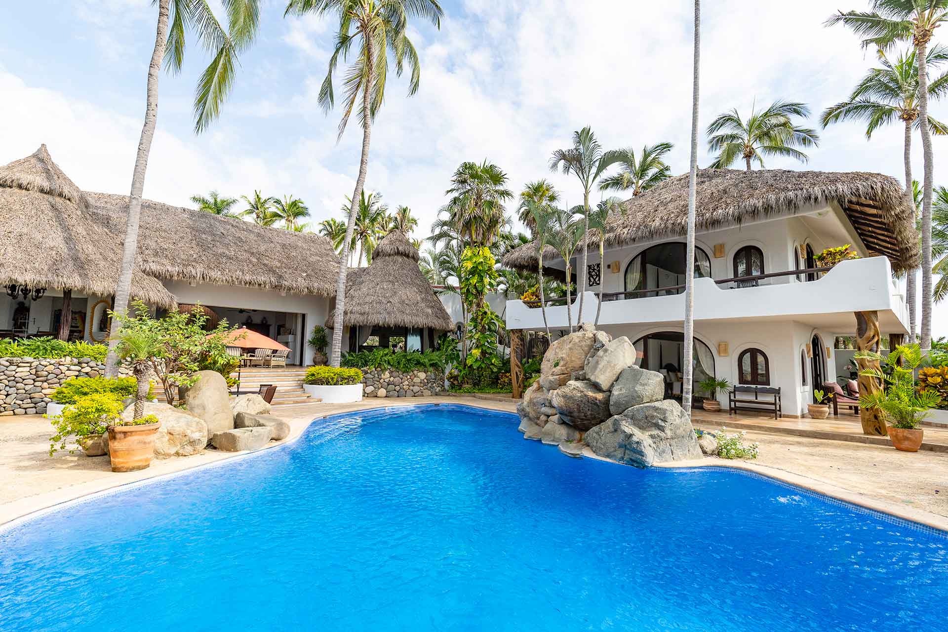 Encompassing over six thousand square feet of living space, El Fenix encompasses four thatched roof, palapa buildings. The five en suite bedrooms are separated to offer privacy, yet they all surround the sweeping garden terrace, beachfront pool and hot tub, providing a sense of close proximity for your entire group. The villa provides four en-suite king bedrooms and one en suite bedroom with two full size beds.