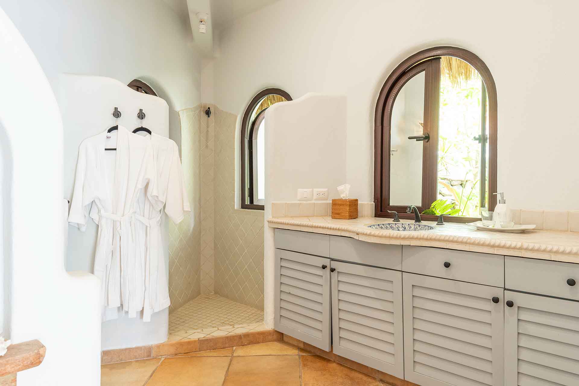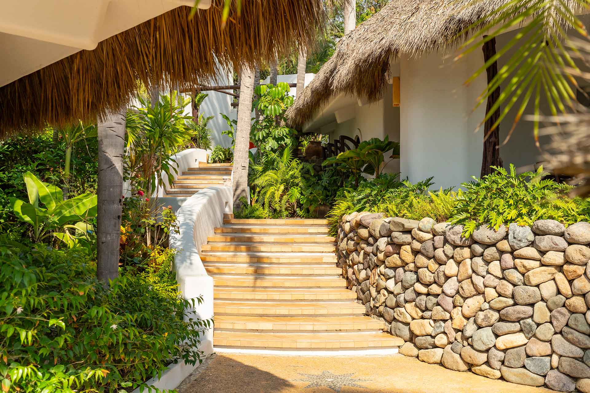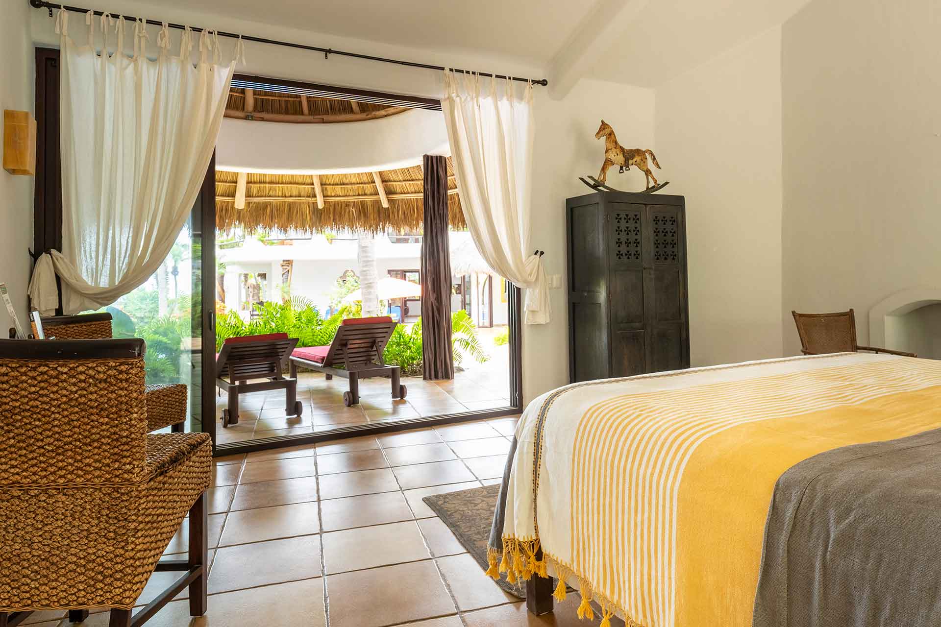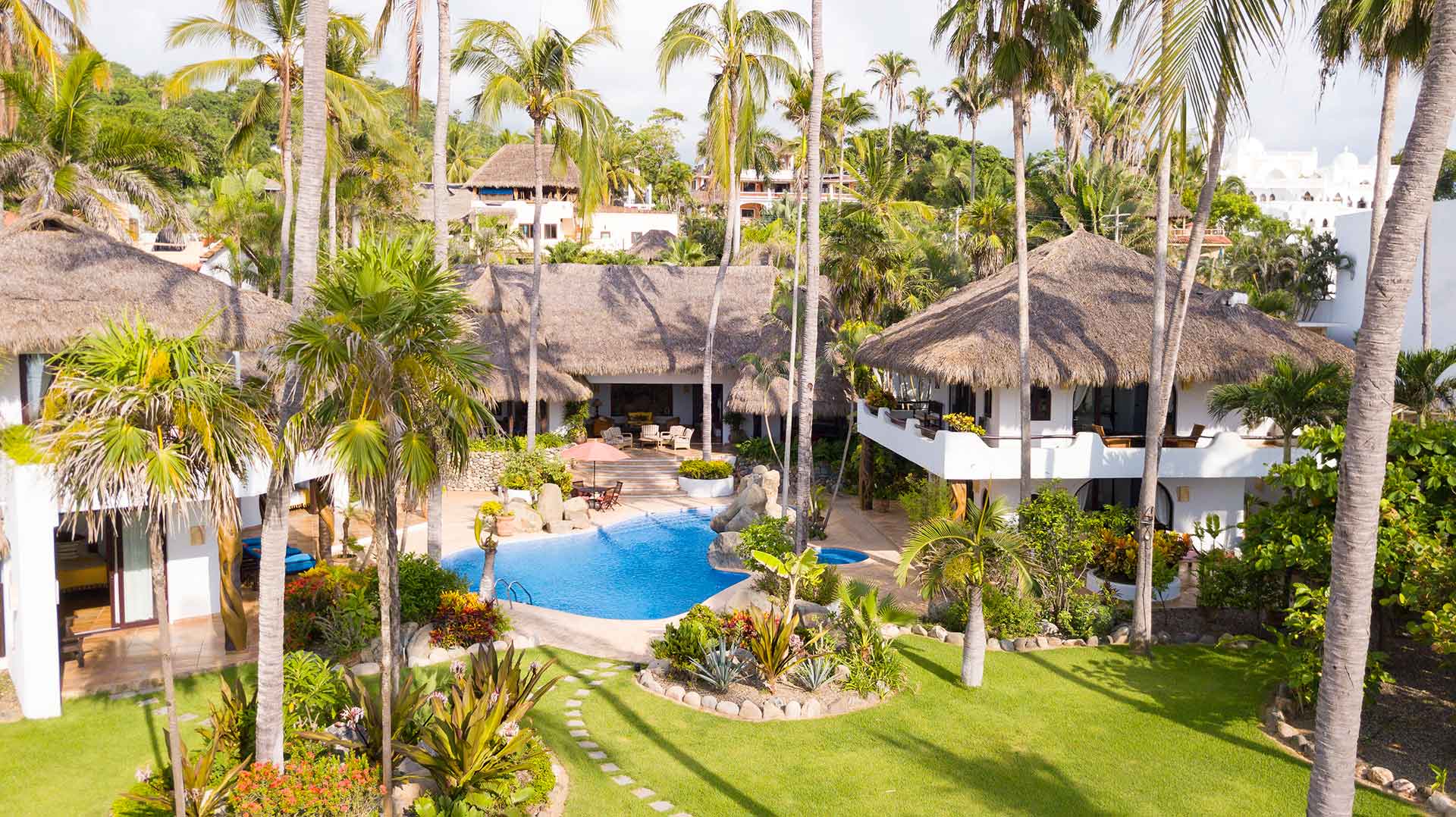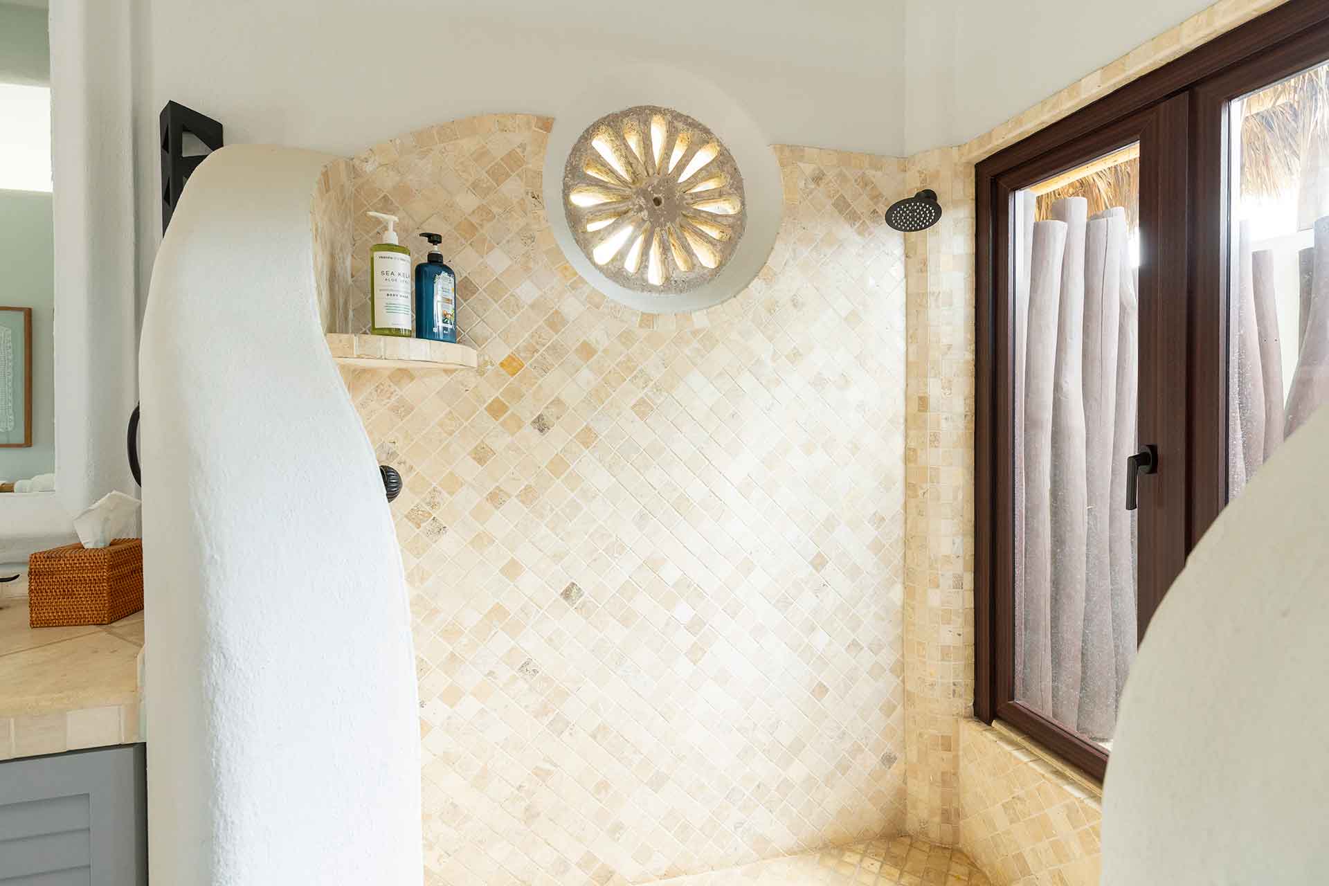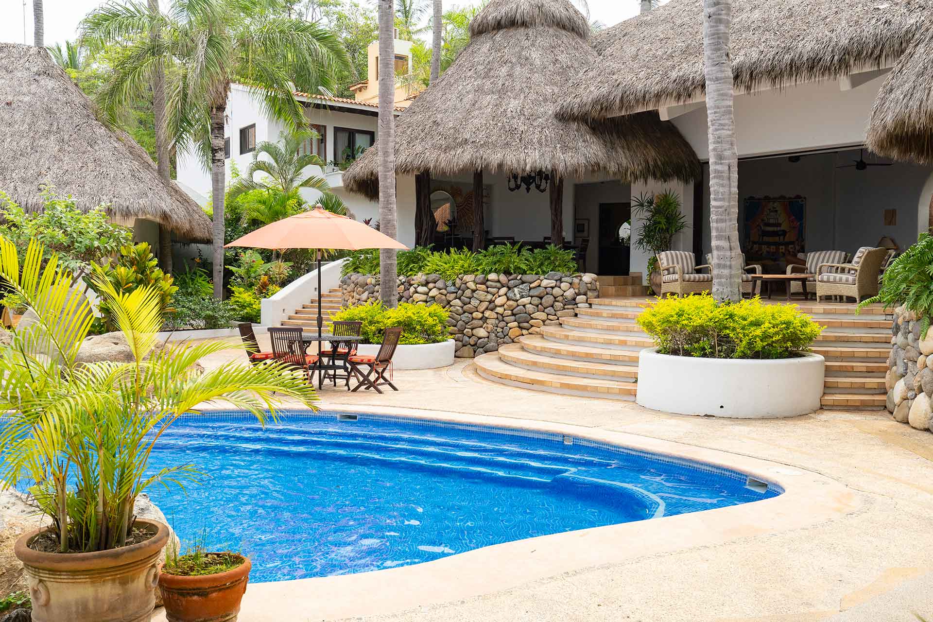 Encompassing over six thousand square feet of living space, El Fenix encompasses four thatched roof, palapa buildings. The five en suite bedrooms are separated to offer privacy, yet they all surround the sweeping garden terrace, beachfront pool and hot tub, providing a sense of close proximity for your entire group. The villa provides four en-suite king bedrooms and one en suite bedroom with two full size beds.