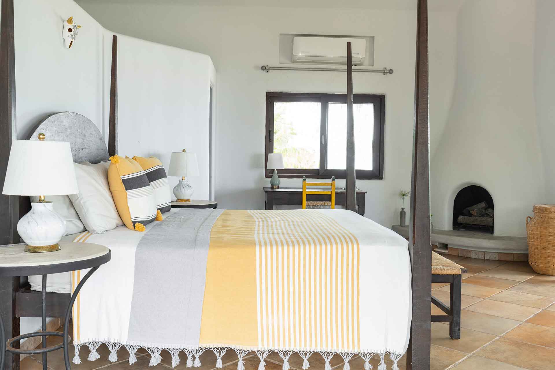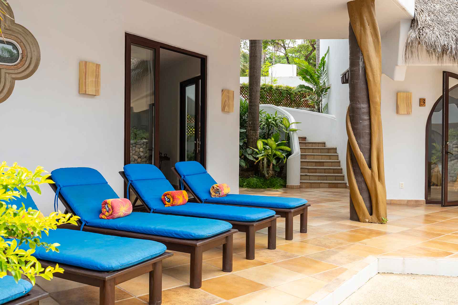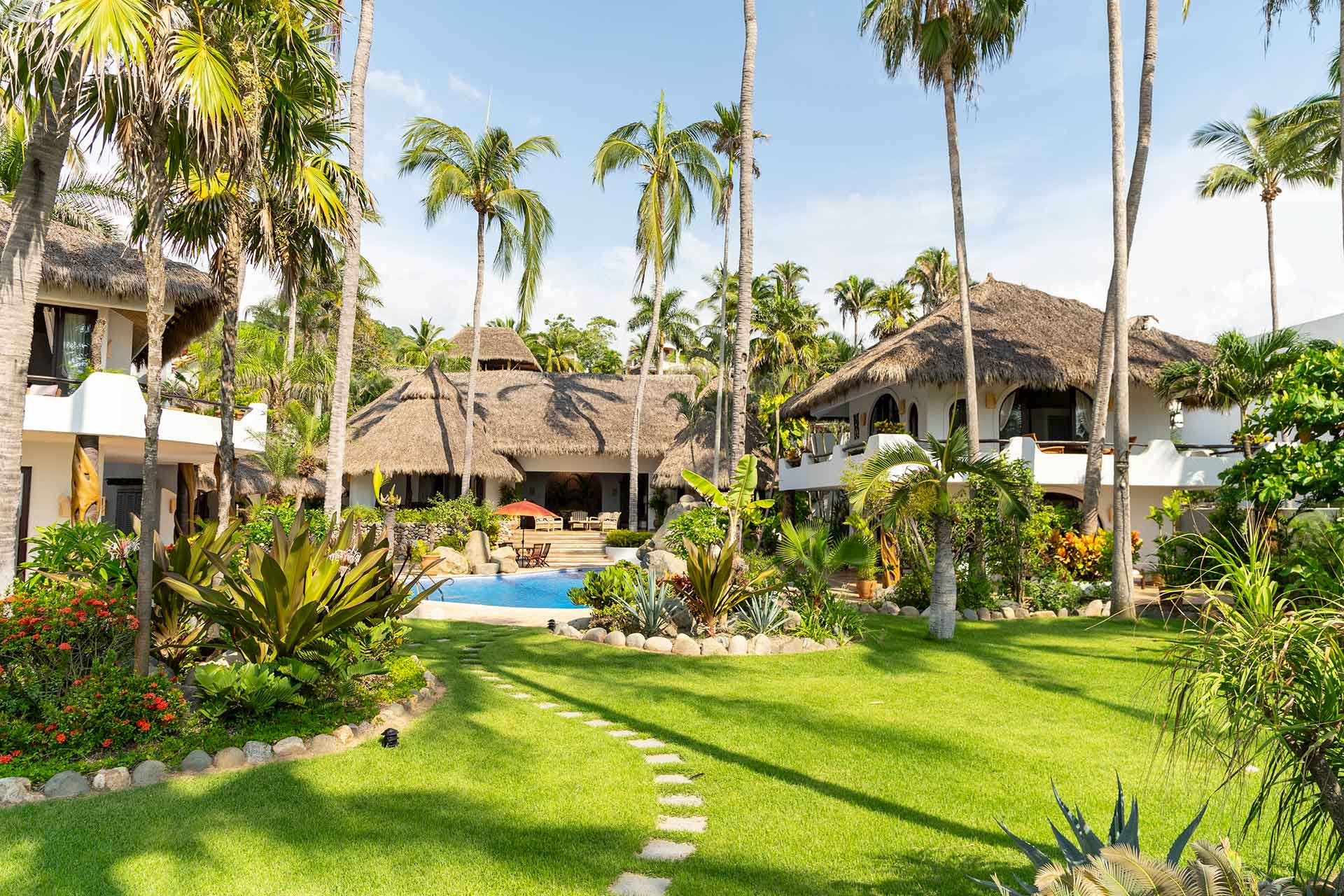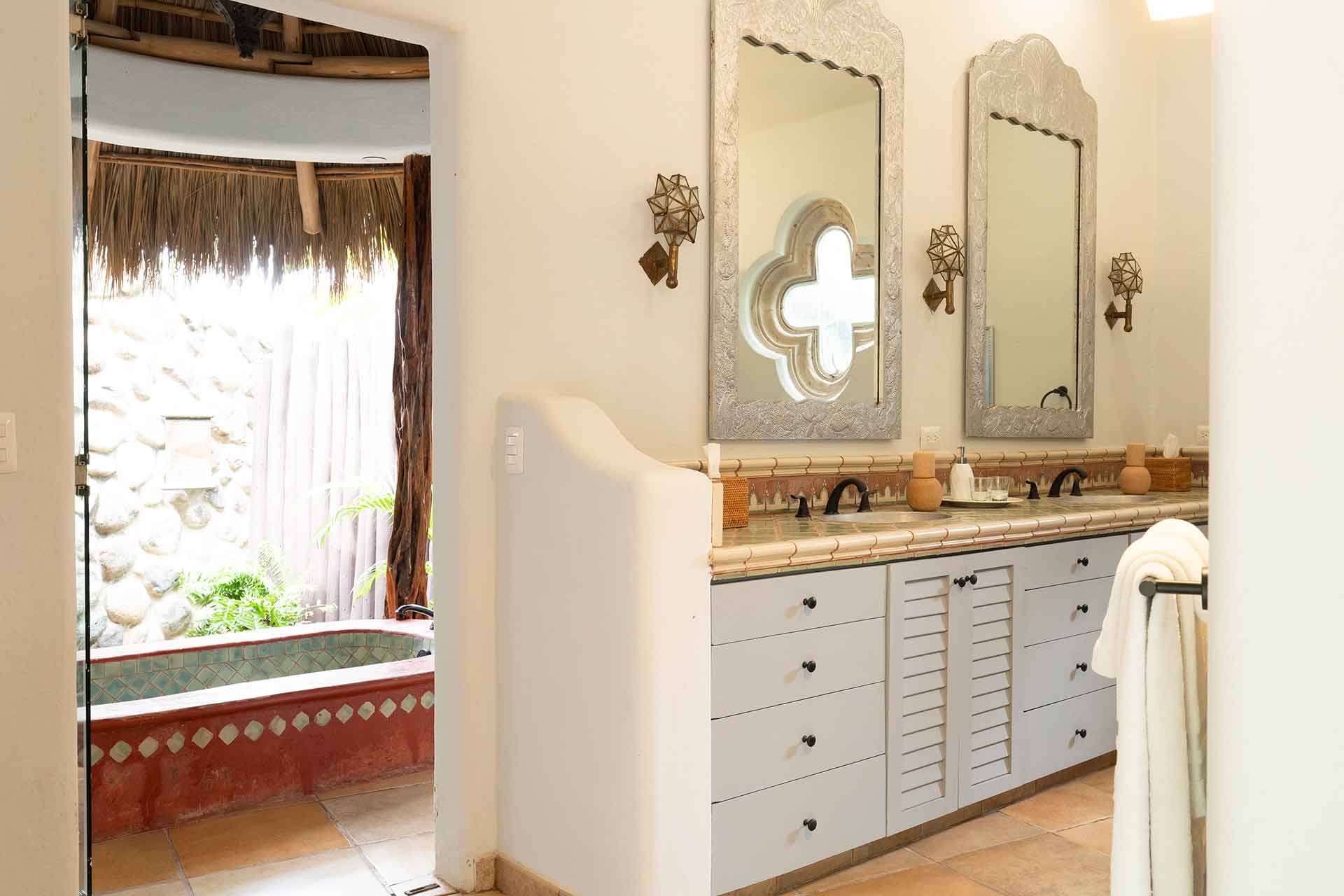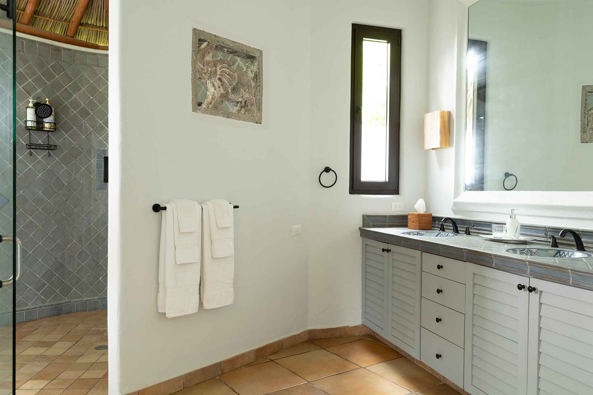 Encompassing over six thousand square feet of living space, El Fenix encompasses four thatched roof, palapa buildings. The five en suite bedrooms are separated to offer privacy, yet they all surround the sweeping garden terrace, beachfront pool and hot tub, providing a sense of close proximity for your entire group. The villa provides four en-suite king bedrooms and one en suite bedroom with two full size beds.