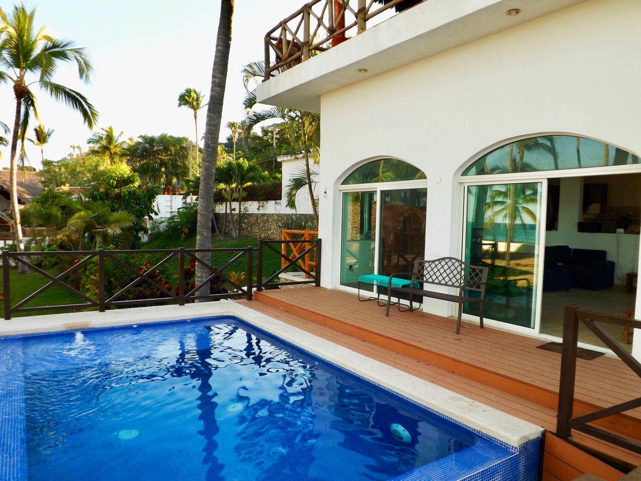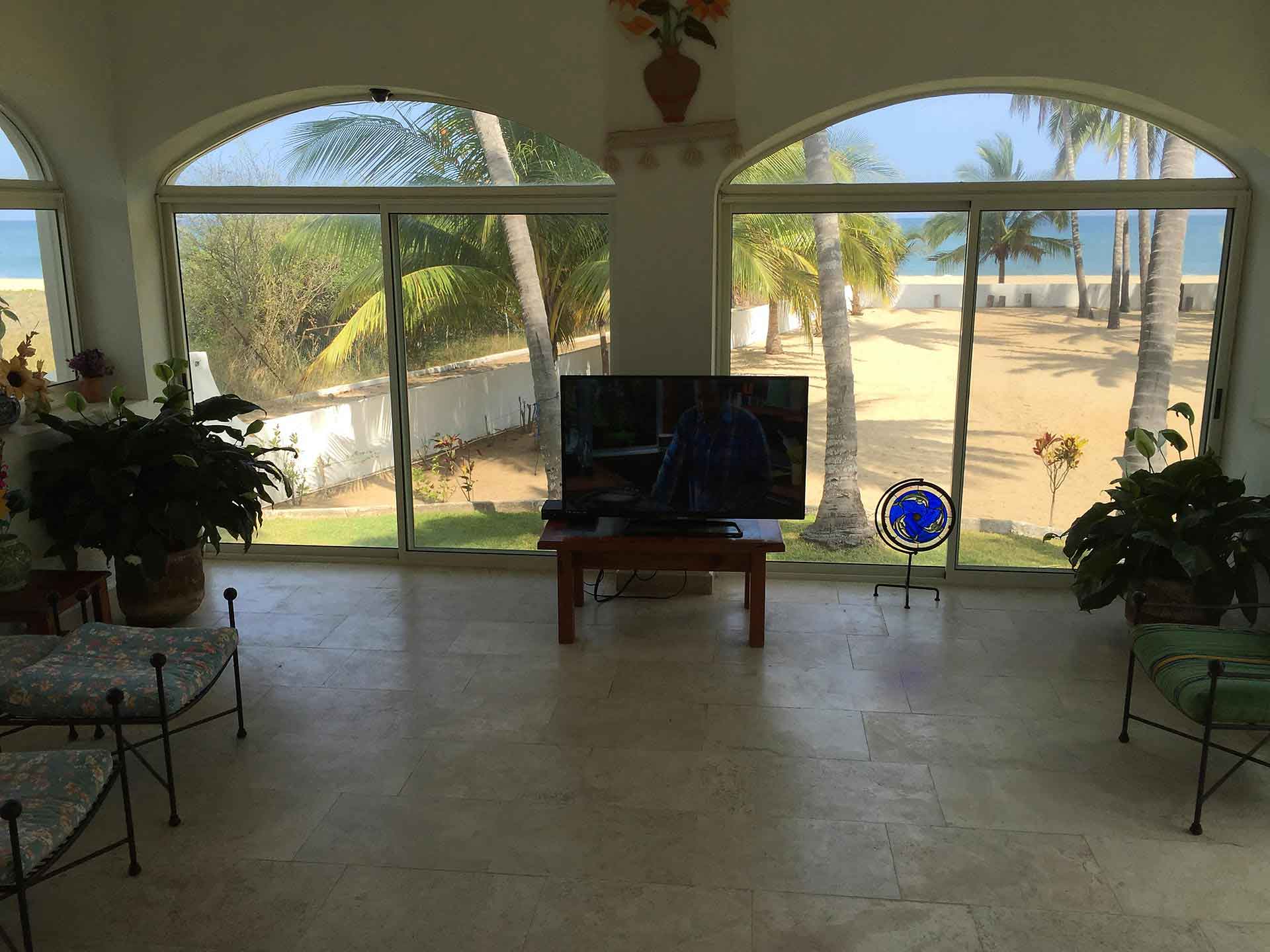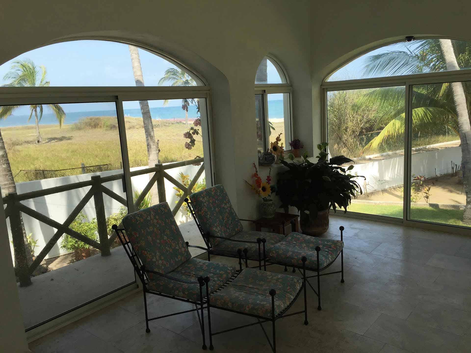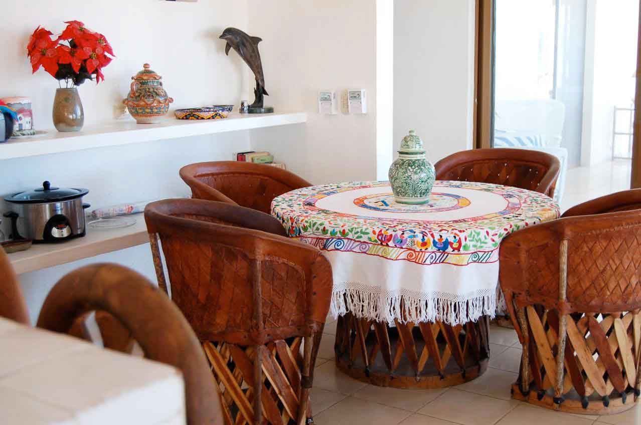 Romero Family House is one of the original villas built right on the San Pancho beach in the prestigious residential area of Costa Azul. This spacious villa sits upon a very large, nicely landscaped, beachfront lot. The Romero Family House’s charming Mexican style kitchen is ample and has everything you need to cook a scrumptious meal, or a private chef can be arranged to cook for you. Enjoy your meals or morning coffee in the glass enclosed den, open area kitchen, or the tiled outdoor terrace.