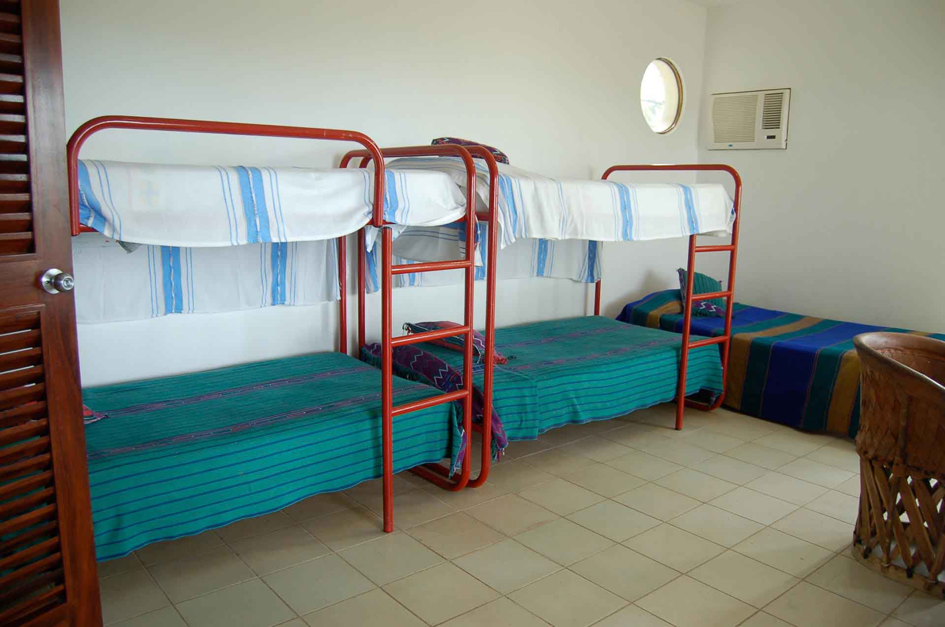 The house has six rooms available. Three rooms with two double beds each, two rooms with a King beds and another room with two bunk beds and one single bed.